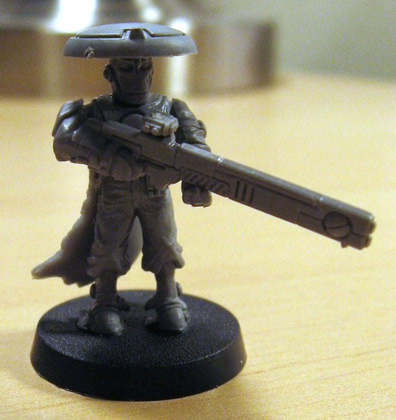 EDIT- Actually If I were you and you wanted a more japanese foot soldier feel I'd remove the helmet (gun drone) and slice down the Tau head a little more so that the rim of the helmet is covering his eyes a little. These style of oriental hats often cover or just cover the eyes or face. Right now it looks a tiny bit too high.
