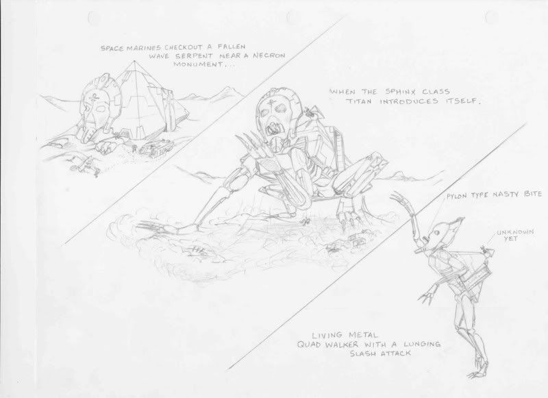 We are talking about a race that conforms to the wish of giant stargods, who take forms that fulfill their desires. A Sphinx, source of engima and mystery, raising out of the ground and killing things, sounds totally like the Deceiver's style. And who says it can't fold its arms in and fly away afterwards? When you're a God, you do God things. And God things are always done with style. I say go for it. I like the drawings, by the way. Although, I agree with Kid Kyoto. Necrons don't really need huge gun bays. Just have crystals. They'll look cooler, I think.