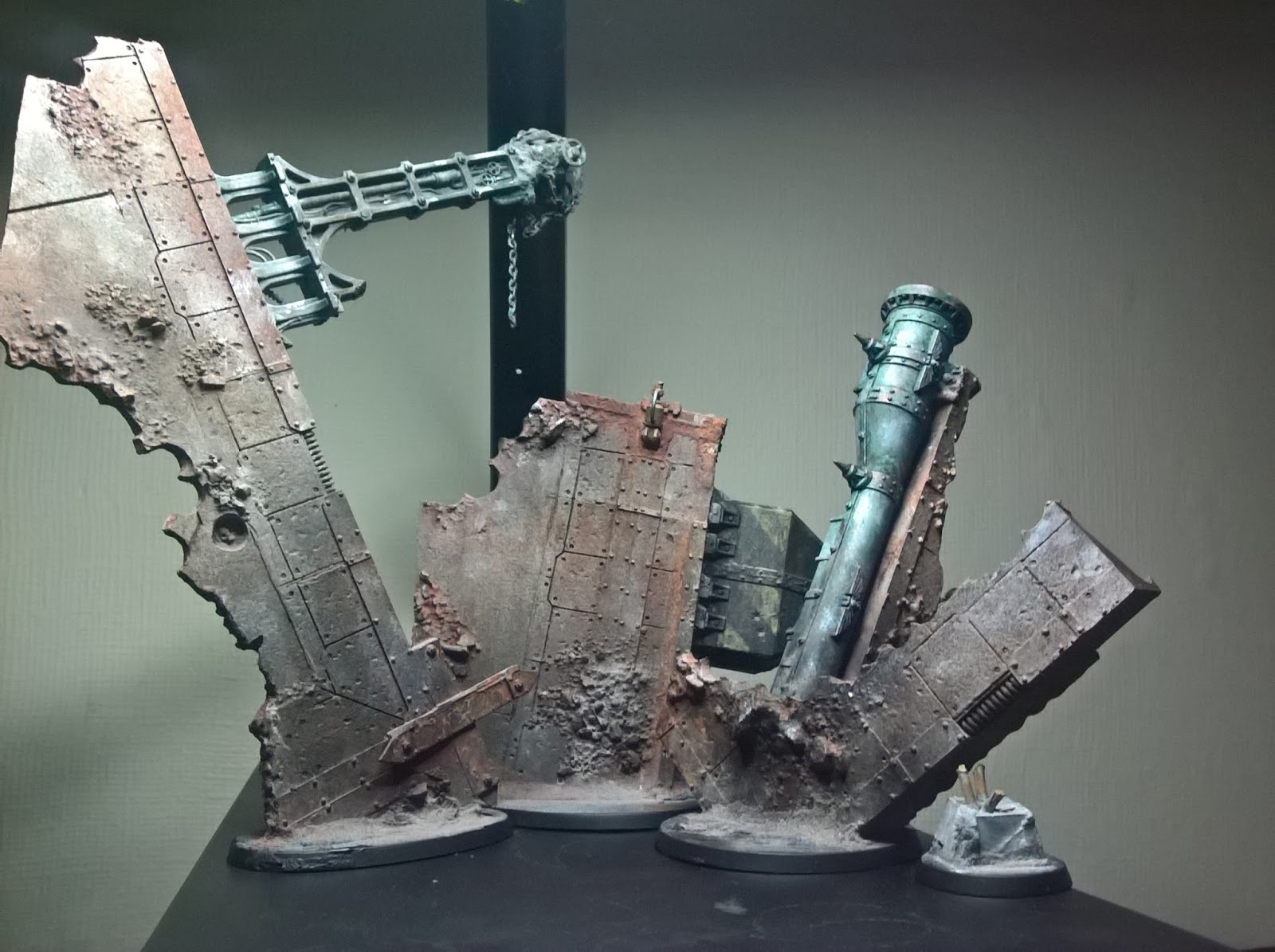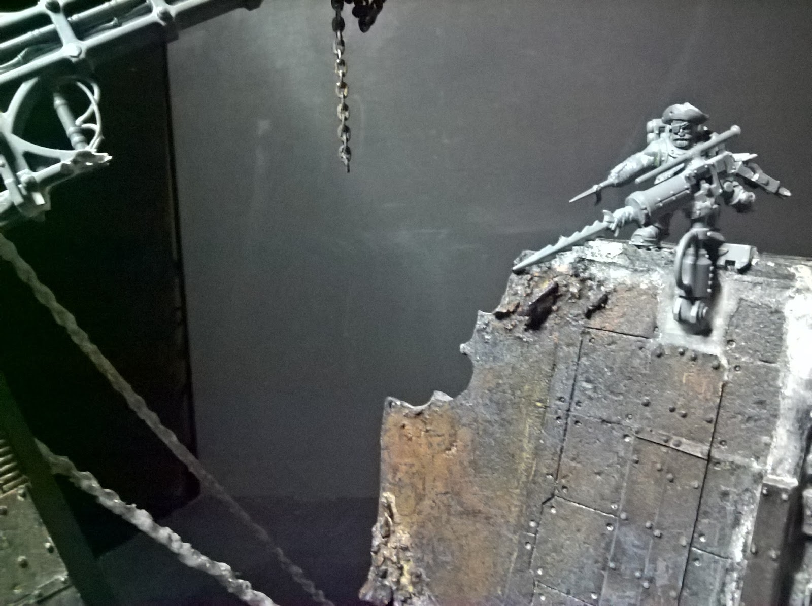 That newest update is just phenomenal. As you might expect I absolutely love the angled terrain — so incredibly evocative. Necromunda tables rarely manage to suggest that they exist beneath miles of city, instead looking like catwalks or spires at the top of an urban/industrial assemblage. The texture and solidity of those big industrial slabs really sell the illusion (more than my scrap-assemblages) and manages to suggest the immense weight of the Hive above.The Sector Mechanicus support struts look so great canted at those angles. And the chains stretched at all angles is right out of the original JB art (also gives everything a sort of nautical vibe that fits with your harpooner).