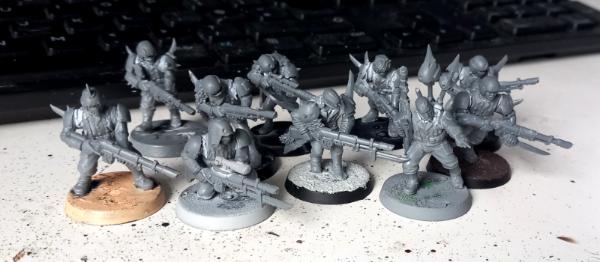 Recently got all the unused parts from a friend's Blooded Kill Team, and having no use for a bunch of Bolt Action US bodies, I decided to make a Militia Recon Squad. I still have to find three more scopes to make three into Snipers and make some camo-cloaks, but the basics are down: