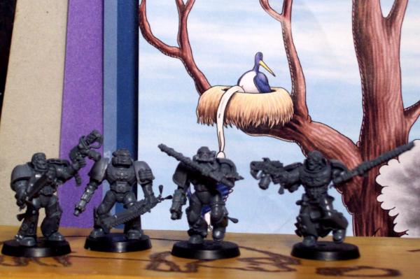 Four assault squad guys are done with the exception of the tear jewels on various parts. I feel that these four are some of the better painted models in the army, after two years I better have improved on my technique. I have another night of jewel effects to paint then Ill be able to upload pics and with the new camera as a bonus.