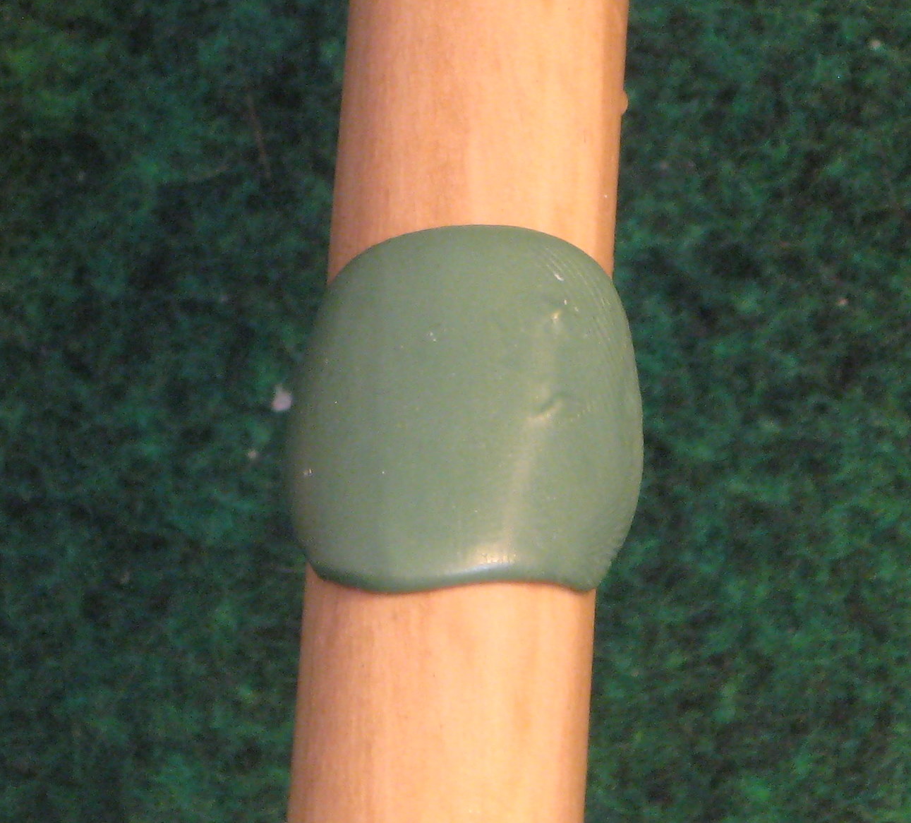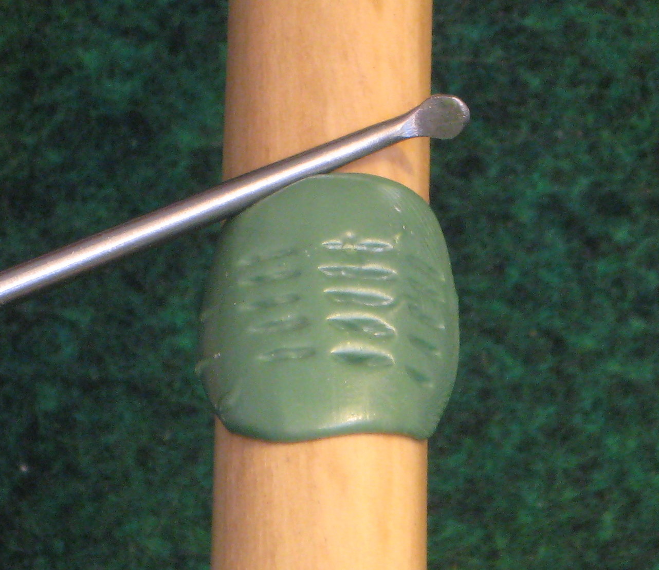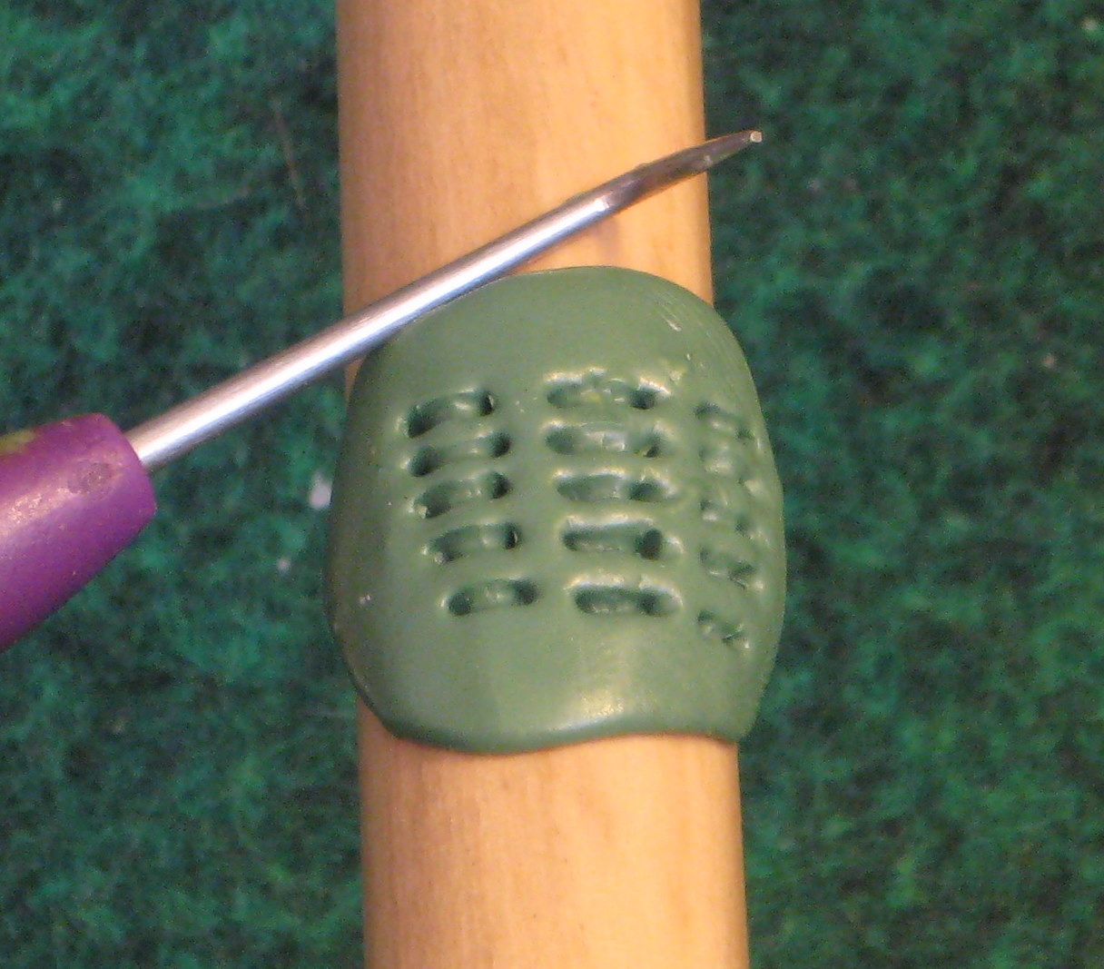 3.) Use a narrow sharpish tool (I used a crochet stitch remover, another of my favorite sculpting tools) to poke a hole in inside each end of each groove. Angle the hole inwards a bit to the putty between the holes is rounded across the top.
