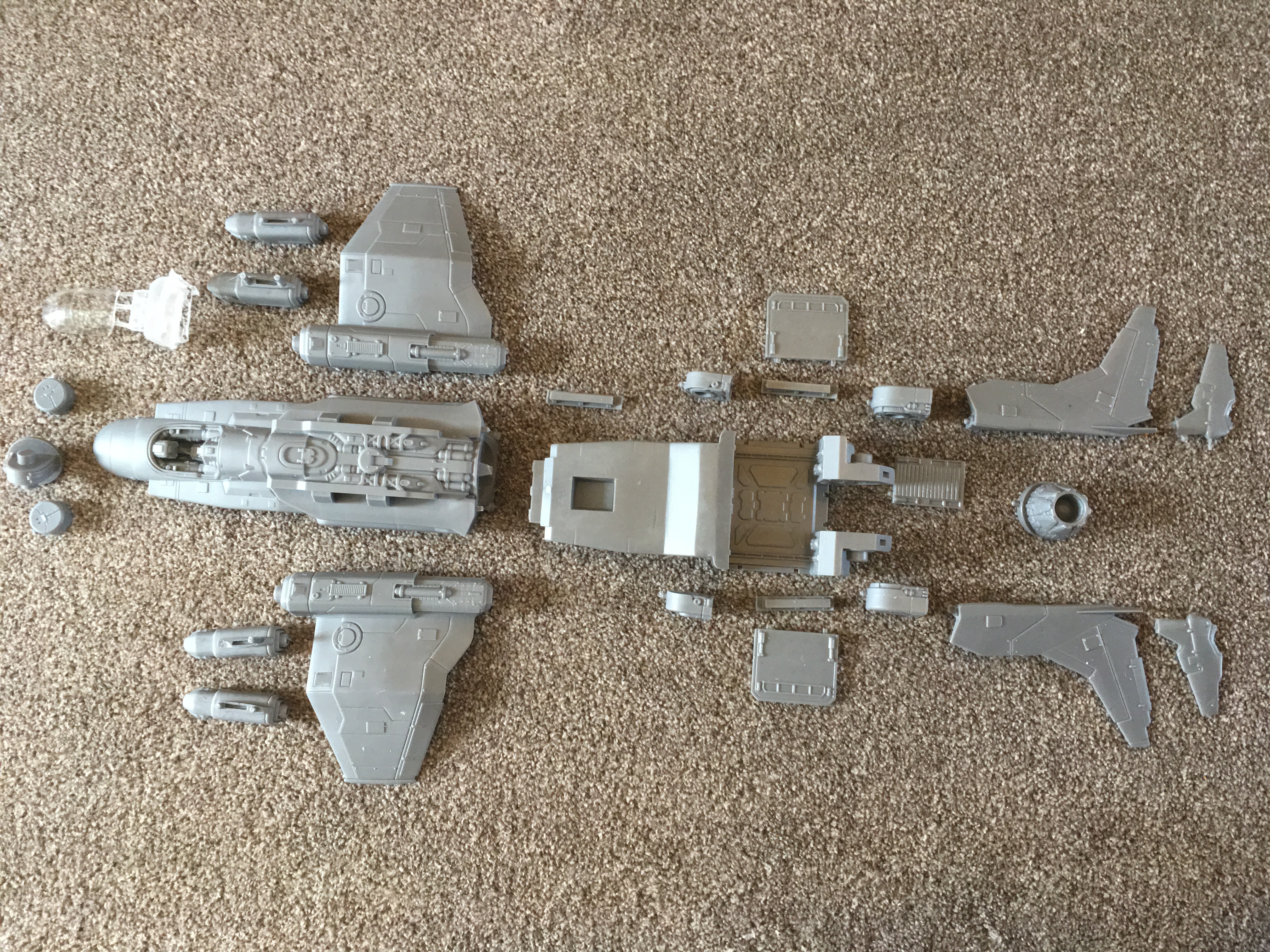 The Roc drop ships are now delivering. Very good cast quality. Some of the resin gates (which normally you'd be hacking off) are actually the plugs to conn ct to other parts. Quite clever really. Here's an exploded view!