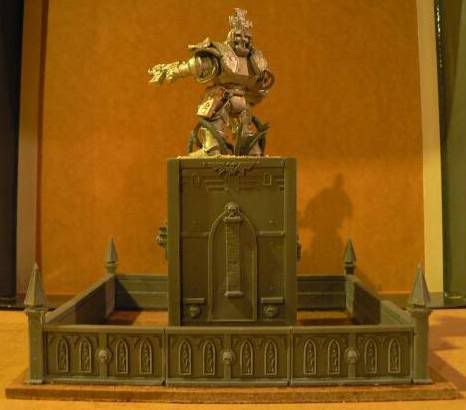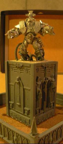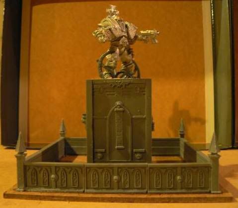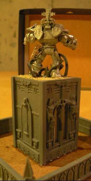 (The square piece Tyrus sits on is plasticard. The BOTTOM of the first square base is glued to the underside of Tyrus' base, leaving the TOP of the base facing downward. The TOP of the second base is glued to the TOP of the first one so that, when Tyrus is removed, the bottom base sits on the table like a normal base would. This supports the piece properly so that the base doesn't bow downwards when in place.)
