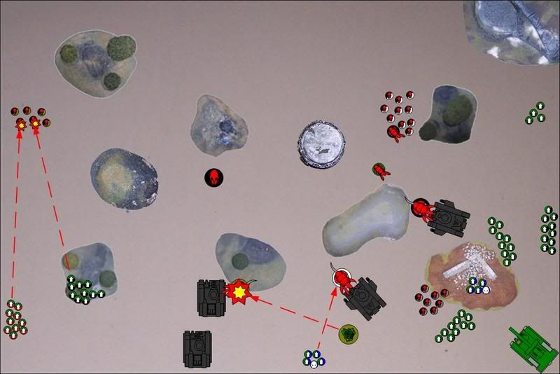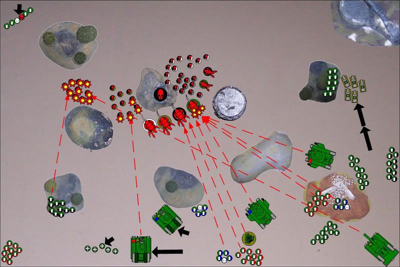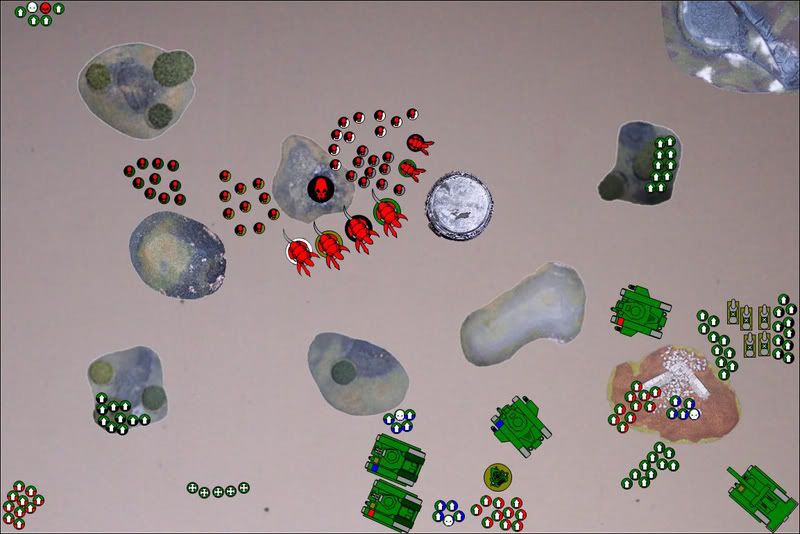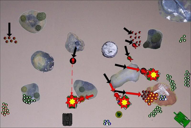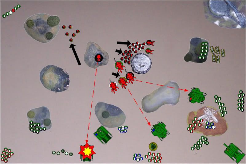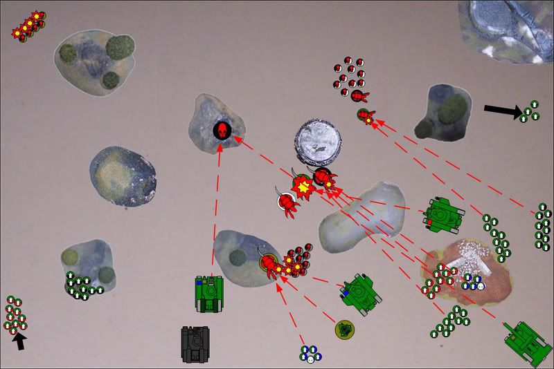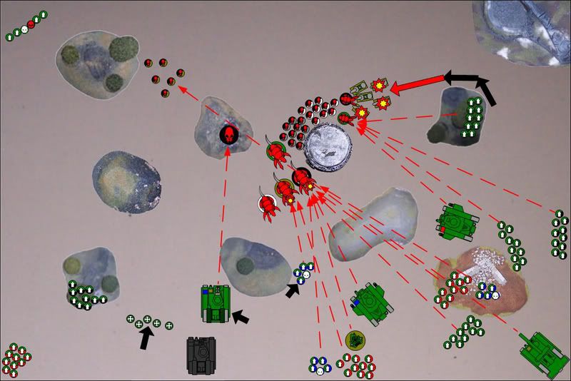 The tyrant finally makes its move and stuns the Hellhound while the nearby Carnifex finishes the tank off. Two other fexs destroy a demolisher each and the Genestealers in the middle wipeout an infantry squad. With the tanks gone this looks like the end for the poor Imperial Guard.