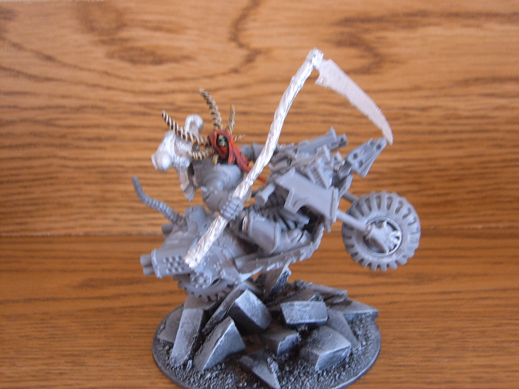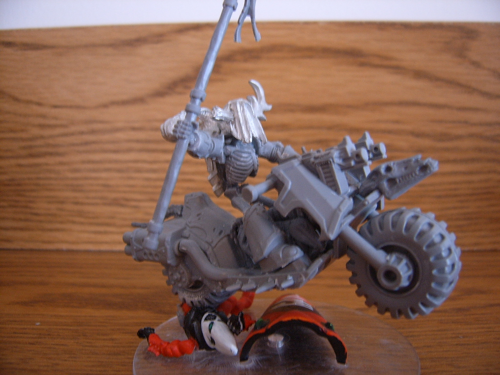 However, through many games with a 4 man squad, and a traditional 7 man squad I've learned the following. They die to mass fire, they die in H2H....I do like your suggestion of attaching a character on a bike...this would give them more of a chance to survive H2H. Now to back up what i've stated. A 3+ invul save is the same as a 3+ normal save to anything that isn't AP3 or better. You still fail on a 1 or 2....sure toughness 6 is awesome and greatly reduces the chances of being wounded.....BUT....if you're caught in that dreadful rapid fire range, you're opponent is GOING to get a number of wounds on you....