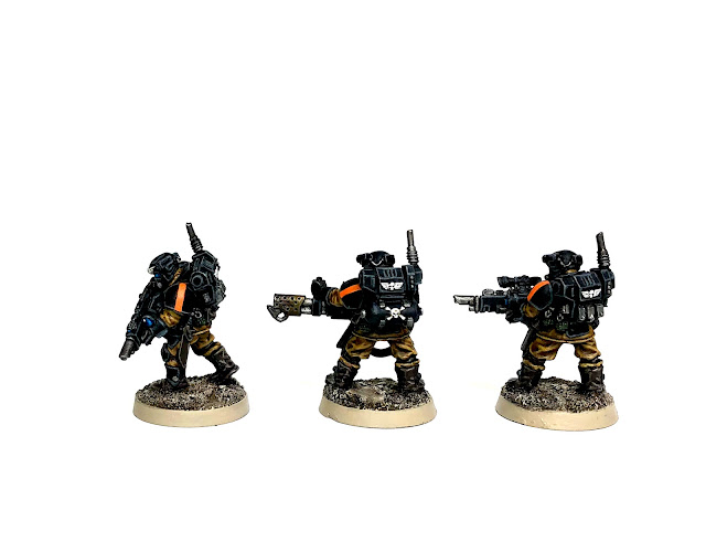 It will be fun to have some flamers in this army. It is something I am currently lacking. I have another one to paint in the next batch of three. Now that I see the photos, I realize I need to darken the tip of the flamer a bit more to give that sooty, burned feel. Overall, these old metal models are fun to paint. I am sure the astute viewers will observe the extra sniper scope. A few in the next batch have additional pouches, knives and grenades. I wanted to add a few bits to these boys to bring them more in line with kitted-out Elysians they are serving with in the 87th.