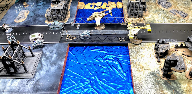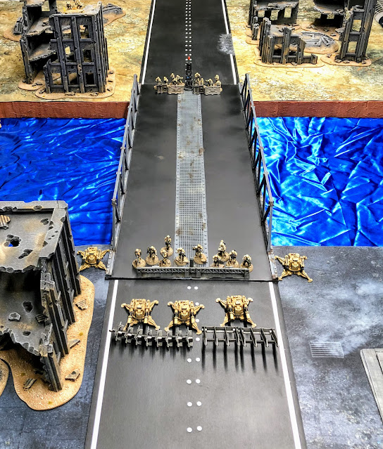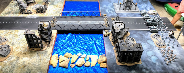 We kept the scenario simple: whoever controlled the bridge at the end of the game won. To control the bridge, you needed to have a scoring unit (Troops choice) on the bridge and no enemy scoring units. In our campaign, this represented the invading loyalists trying to secure bridges around their target landing zones so that their main armored force could quickly breakout from the beachhead when they arrived. The drop troopers took this bridge in a night drop and now have to hold it against enemy counterattack until the invasion forces arrive (so yeah, basically D-Day...).