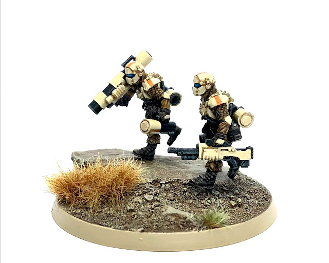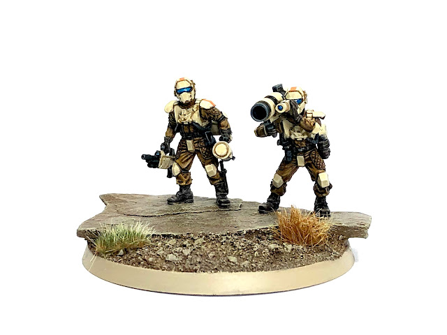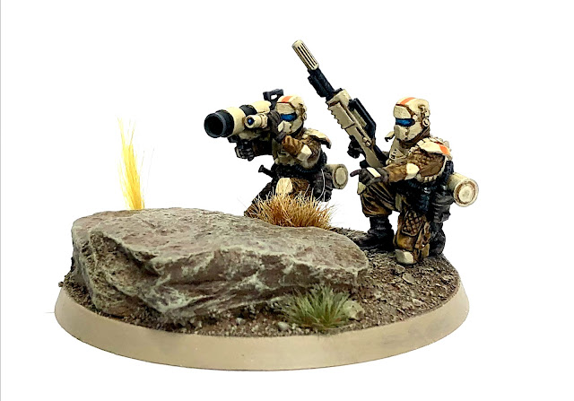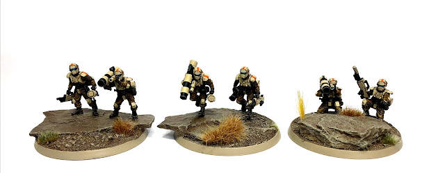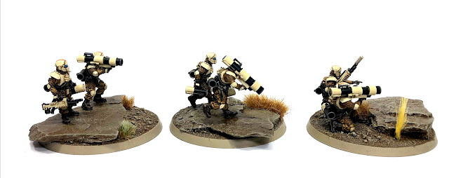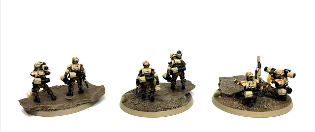After several years working on this army, I have finally hit a long-overdue milestone: my first heavy weapons squad. I know it has been a while since I painted any actual Elysian models so I tried to remedy that with this missile launcher squad. I went with a running team, a standing team and a crouching/kneeling team, figuring the two men would be working in unison so it would make less sense to have one running and one kneeling, for example.