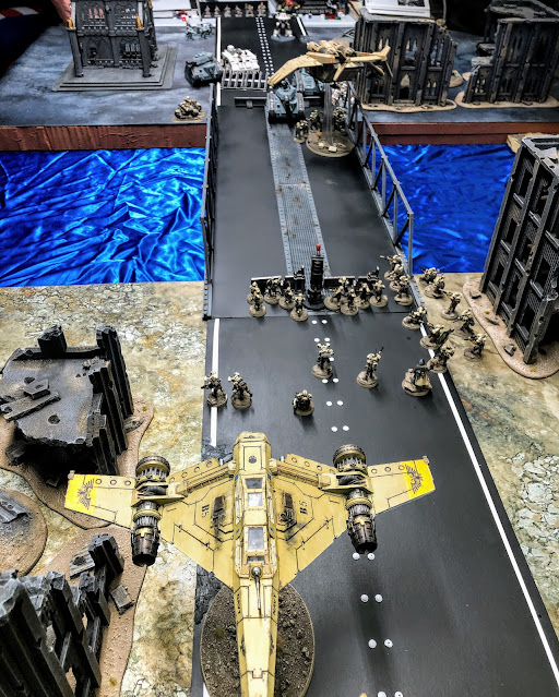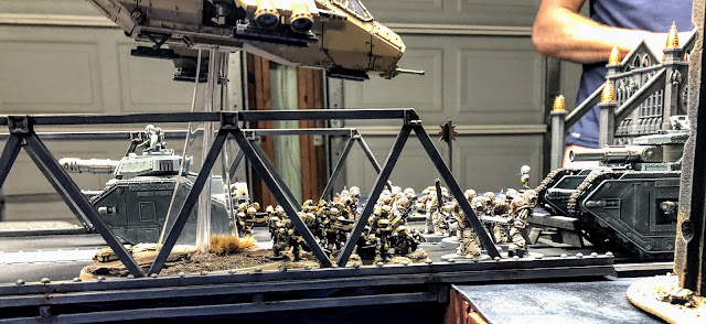 An Avenger Strike Fighter of the Imperial Navy dives over the bridge, taking down several Death Guard marines with its avenger bolt cannon. Meanwhile, a Valkyrie hovers over the bridge and another squad of the Xhorik 87th make a drop in an attempt to hold back the enemy advance for as long as possible.