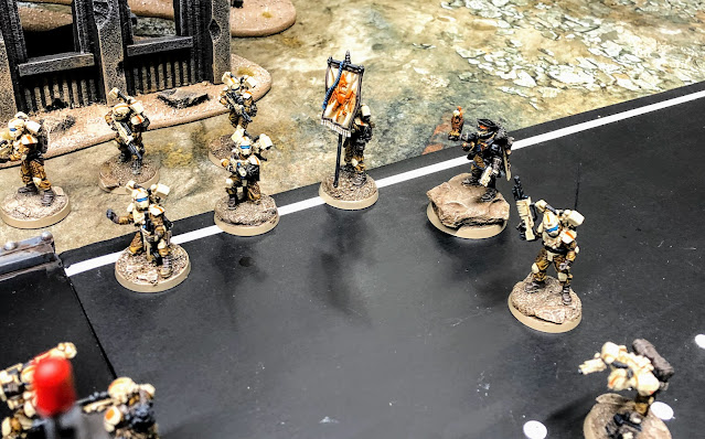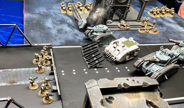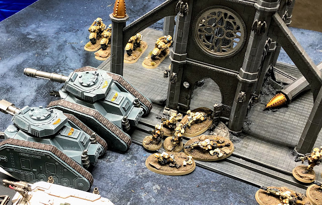 The game was a bit like the bridge battle at the end of Saving Private Ryan: a platoon of lightly armed paratroopers trying to hold a bridge against enemy armor. It was only thanks to the makeshift Aegis Defense Line that my troopers survived long enough to slow the enemy down, preventing them from sweeping my second line off the bridge. Unfortunately, the most effective strategy was to throw my units into the enemy line as speed bumps and distractions so I could hold on to the far side of the bridge. It worked, but was not very satisfying, as I mostly failed to inflict any serious damage (destroyed only one tank). I kept the traitor militia pinned in their back line with drop sentinels and recon bikers while I threw unit after unit into the meat grinder to slow the more aggressive and dangerous space marines. Captain Brown's Avenger made its debut and was decently effective at eliminating space marines in power armor, something the rest of the army struggles with, so that was a plus.