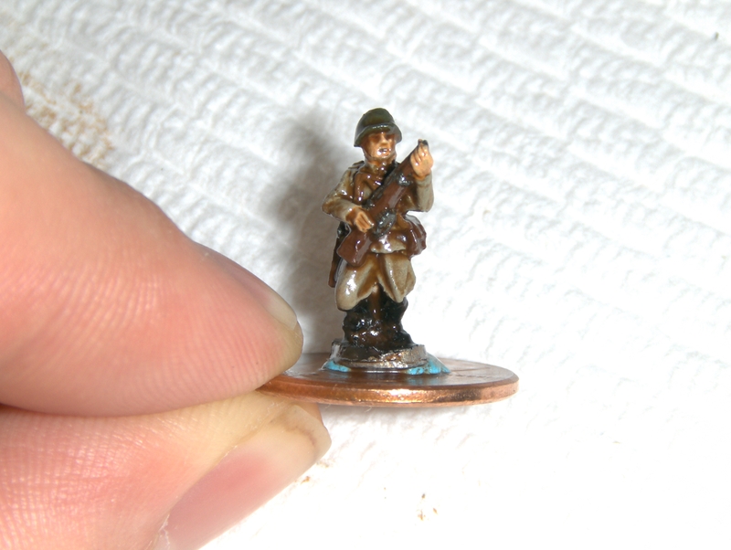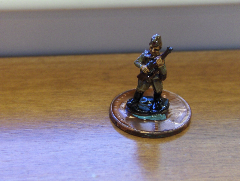 Well, there's a Flames of War tournament coming up next month that I want to play in, and crazy as it may sound, I think I'm going to try to paint up 600 points worth of Soviets in 15mm. I wanted to experiment with dipping, so I did my first stand as a test to see the results. I'm pretty happy with how they turned out. The helmets are a bit too dark, so I think I'll mix in some white to lighten it up on the rest of them. I used Minwax Polyshades Antique Walnut as the dip. I painted these with a mix of Vallejo and