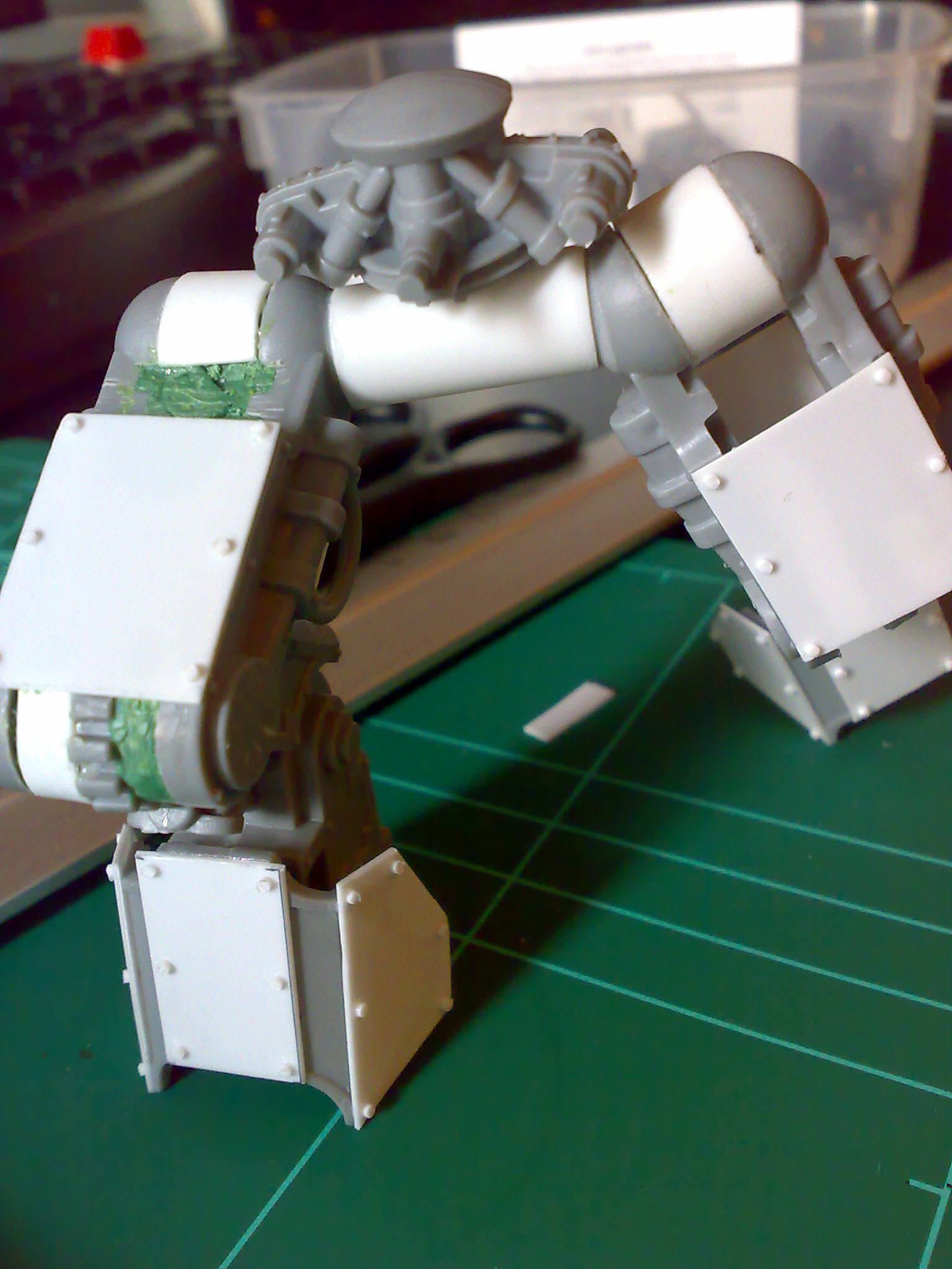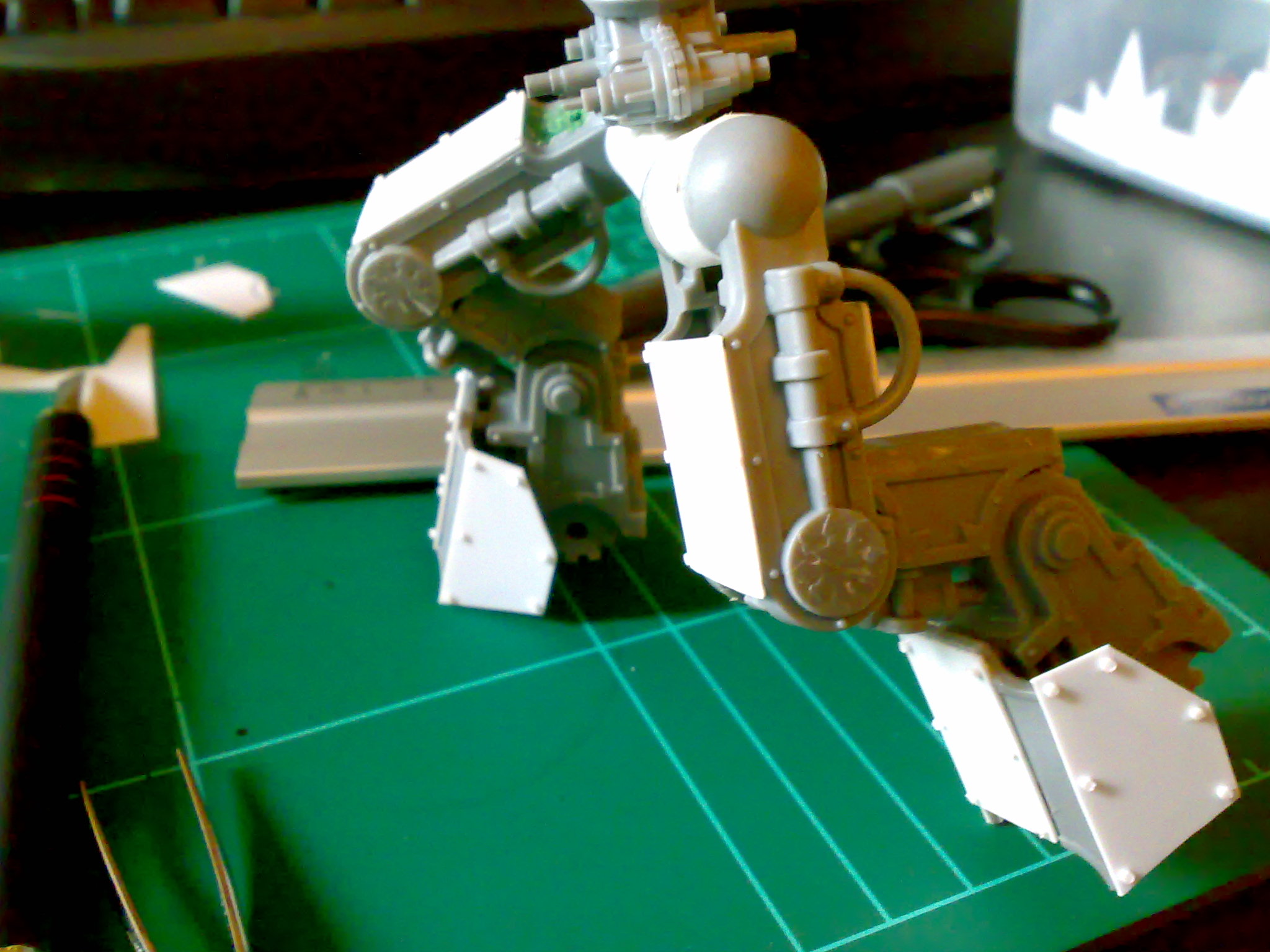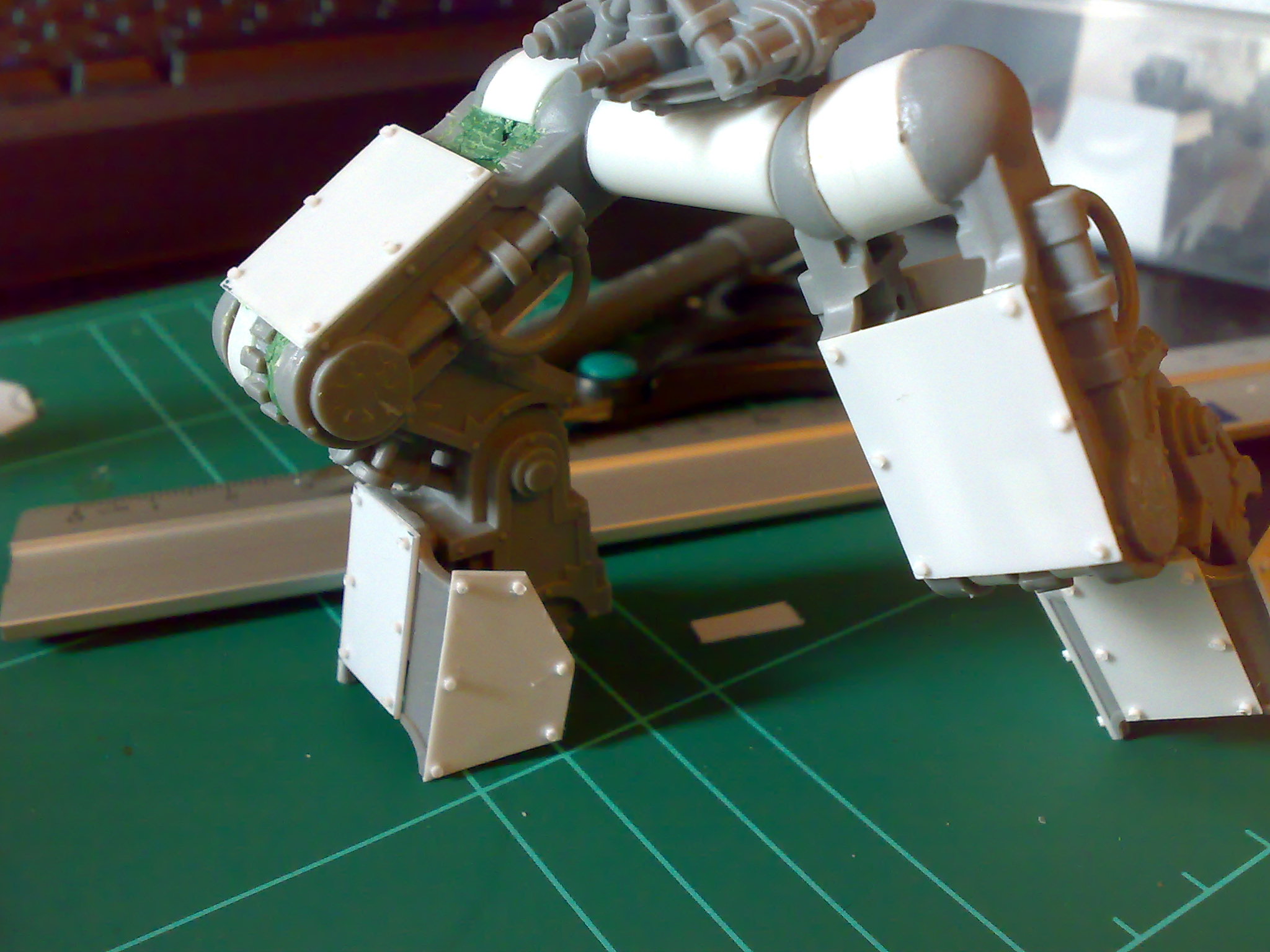 i like the solid toes WAY better. But i like the way the newer toes come from lower down the leg. Could you make the first toes as part of a foot that extends from under the shin armor? The foot could be with plasticard coming off of the lowest joint piece that is behind the shin armor. It would look way mecha.