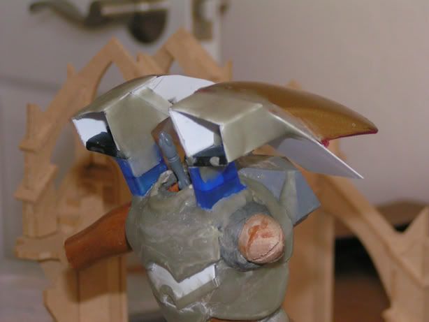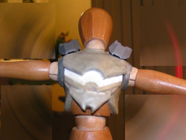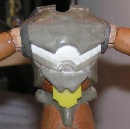 What your seeing here isnt a manikin crying out in agony and wondering why God has so defaced it, but rather the next step in the armor filling. all the light gray is Apoxie, which has been doing a wonderful job. it smooths like glass with a little lick of the finger and cures rock hard. by layering, i was able to sculpt out the flank flaps and the front armor. those things on the shoulders are inverted eldar cockpits, just there as a placeholder, they'll be removed later. here, have a closeup!