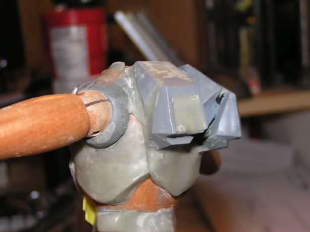 you can see the dark gray construction epoxy around the shoulders, it's not very smooth, ill fix it later. When these dry I can move on to filling out the torso