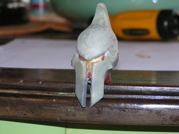 Its an Iron Man Pezz dispenser head. 3 bucks from 7-11. the candy was horrible, but the head was a perfect place to start. I glued two pieces of sprue to the cheek bones to flesh them out, then each vertical section of the mask was two sprue sides glued together and cut. from there, putty and let dry.