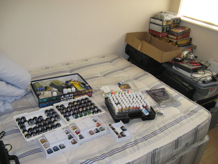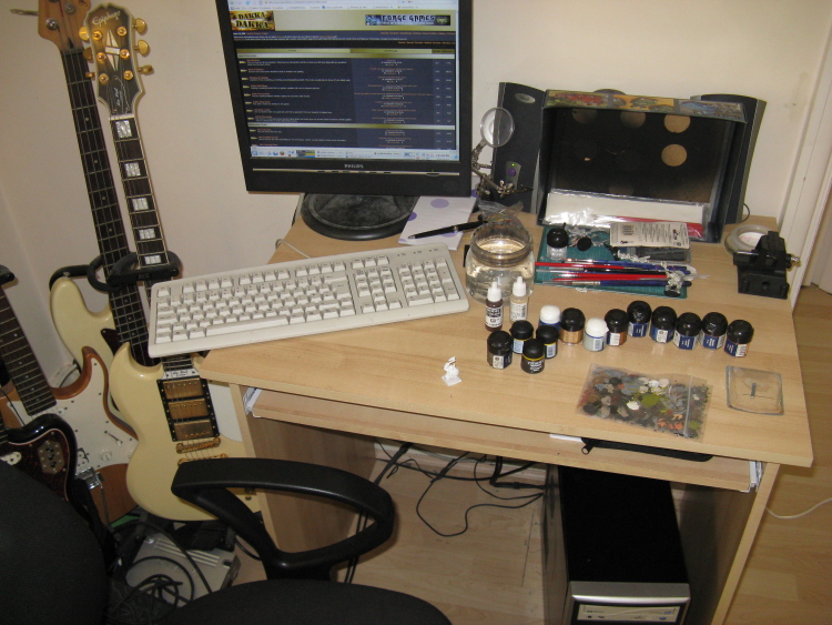 I also took some pics of my painting area which is in our guest bedroom. We just had people over so I had to clean it all away, but now they are gone it is set up again, but is deceptively clean so it seemed like a good time to take a picture. That is just a web browsing and music recording computer, dakka development occurs on a different machine.