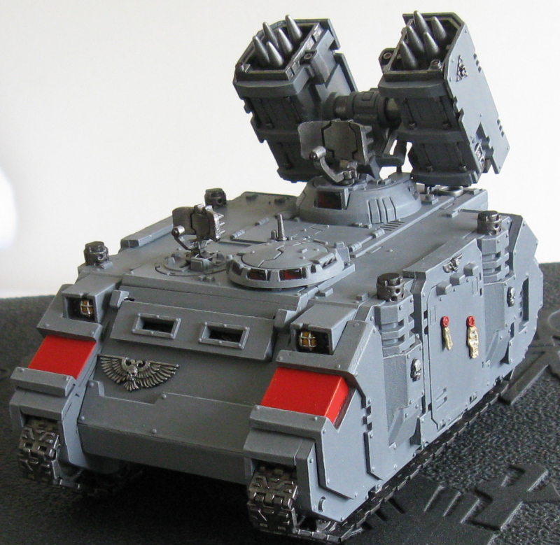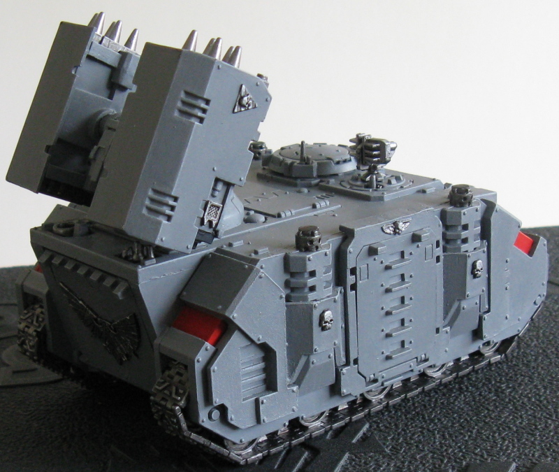 Finally, my space marines whirlwind. This is the same, unnamed chapter and again, weathering and transfers are still pending. The army symbols will be going on the red parts, and I still need to neaten up the purity seals on the right hand side a bit too. This was a very experimental bit of work as it was my first plastic tank in many years, and was also my first time working with forgeworld resin (the extra armour), which barely fit and was not much fun to use. It has a custom rear door as well, which also required a lot of work to trim and fit.