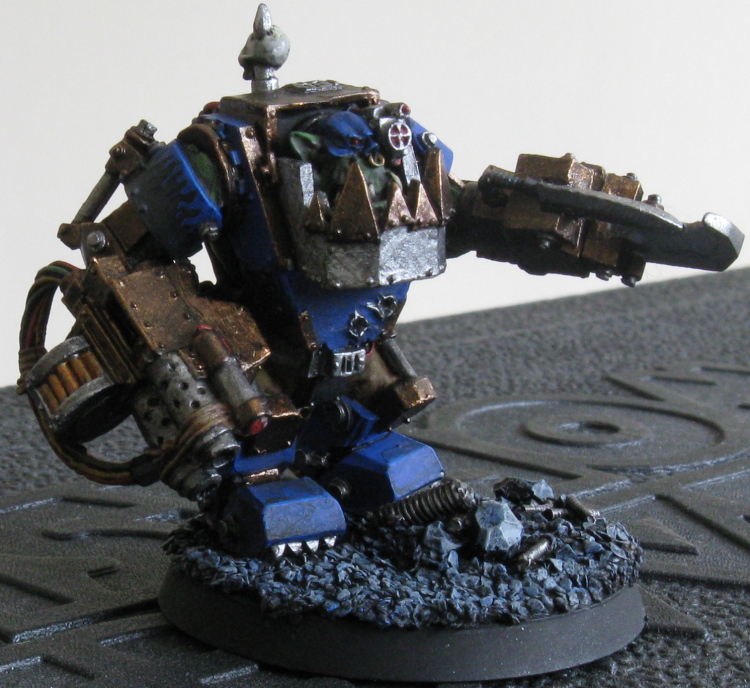 Finally for today (and for a while), here are some better photos of my entry for the 2008 Q1 dakka painting challenge. The model is an Ork Meganob which I painted in deathskulls colours. I used to be a fan of Snakebites, but when they got rid of Zogrod Wortsnagga, I switched over to deathskulls. The deathskulls are tough to do well as they have a huge number of colours that prevents the models from looking very consistent (blue + green + clothing + weapons = noisy). I went for a bronze/brass complement to the blue of the deathskull and tried to minimise the usage of green where I could.
