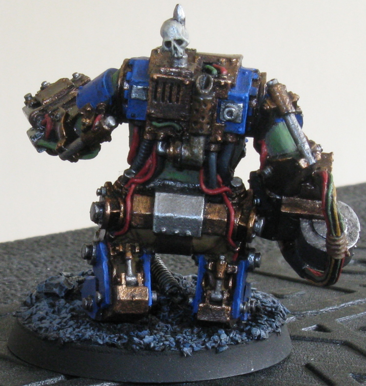 There were quite a lot of mistakes I made too which I have learned from. First of all I dont like the green skin, I should have used a darker base colour and less yellow toned greens. The bronze/brass highlighting should have gone a bit further and the highlighting on top of the gun is too overpowering compared to the rest of the model. The black flames on the shoulderpad are too ugly and should have been skinnier. The wires should have been shaded and highlighted more to make them look less like they are just painted over black. Finally, I should not have rushed to finish it in a hotel in las vegas, and then taken a bad photo in poor lighting for the contest as that made me place lower than I think I might have otherwise!