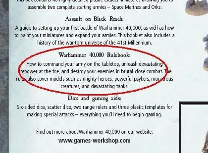 The Warboss is pointing at it. Like BFSP and BFM, it comes with a minibook and a quickstart thing.