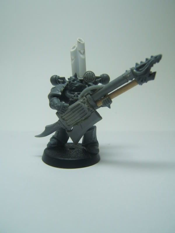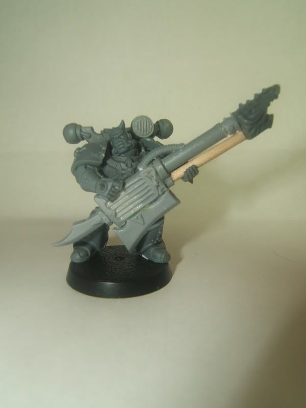 cheers guys, i've wanted some noise marines for a while but don't reall like the style of the weapons in the emp children set (plus you only get 2!) so i did a google search on noise marines to see what people had come up with. originally i was going to use old chaos warrior shileds as the bodies of the sonic blasters but when i dug out what i had i noticed that the halberds in the set would be nice as the necks. the first few things i tried didn't look right but when i was getting the parts off the veihicle sprue i noticed that the durge caster would make nice bodies so worked off that, it was then just a case of building the marines and adding whatever bit's i had knocking about that looked noisey.
