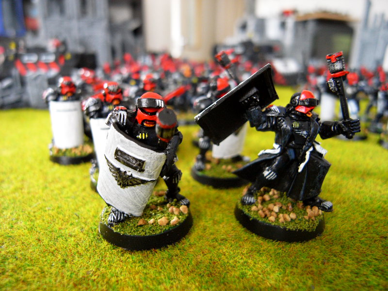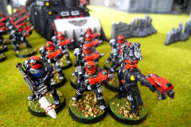 PROS - Take Command HQ with Missile Launcher/Heavy Bolter/Special Weapons/Sniper Squads. Take Shock team as Hardened Vets with Close Combat Weapons. Take judge as preacher??. All other squads are stormtroopers (grenadiers) and count boltguns/combat shotguns as hellguns?