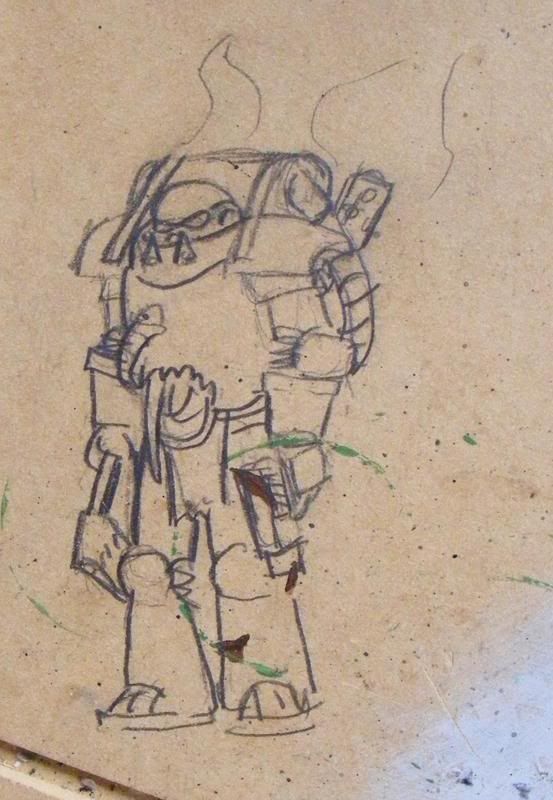 For the next one I would like to change out the rivets for smaller rivets (that was the smallest Plastic Dowel I had at the moment) and more of them, maybe shrink the diamiter of his collar, add more glyphs to his armour, twist the exhaust ports upwards a bit more and possibly shrink the canister. The original sketch I had straps wrap over the tank and attach to his shoulderpads to emulate the suspenders of the Ork, might try that out to see how it looks with the next guy.