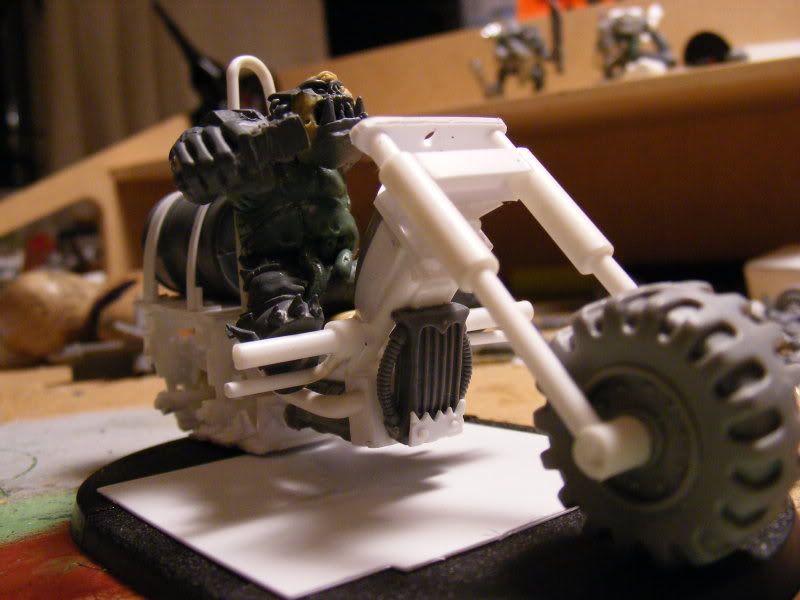 All that workin on a Raven Wing bike got me inspired to get some Warboss action goin on. Here is the Warboss' bike thus far. I wanted to bring it back to the O.G. tracked bike business that Orks used to be all about and in a way it is a study for a potention real life tracked ratbike. Anyway here are some pics.