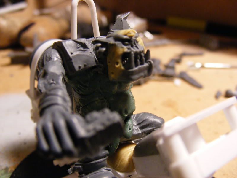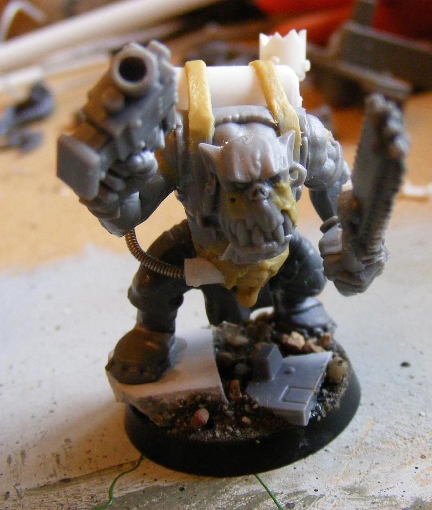 Ork styled shoulder pauldrons, canister of plague junk instead of a power source, exhaust pipes like any good Mad Dok would pump out and with an extended collar with a few teeth reminiscent of Gorka Morka Digga Nobs, and a smaller Ork Choppa and Slugga.