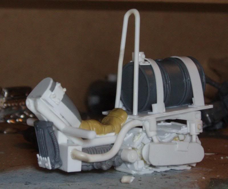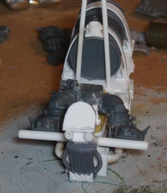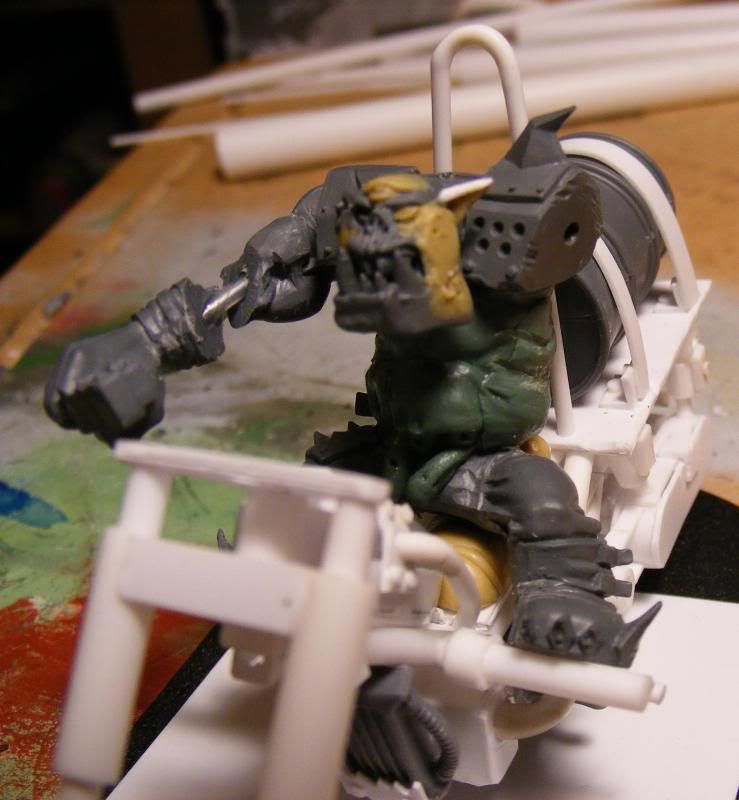 The face I am pretty much done with and the body still needs more work, but that will have to wait till the hundle bars are done so I know where the arm will rest. Might be hard to tell but there is a third eye up on top, and uh..... never thought of myself as religous but uh... THANK GOD FOR A PLASTIC WARBOSS!!! Cutting and repositioning him would have sucked if he were metal!!! Anywho, the struts for the forks are just sitting there and have not been glued either in case they need to be lengthened or shortened. To the guy that was asking for a tutorial on how to make the tracks sorry I did not take pics back then but I'll be making more of those blasted track pieces when the Trukks and Rhinos come.