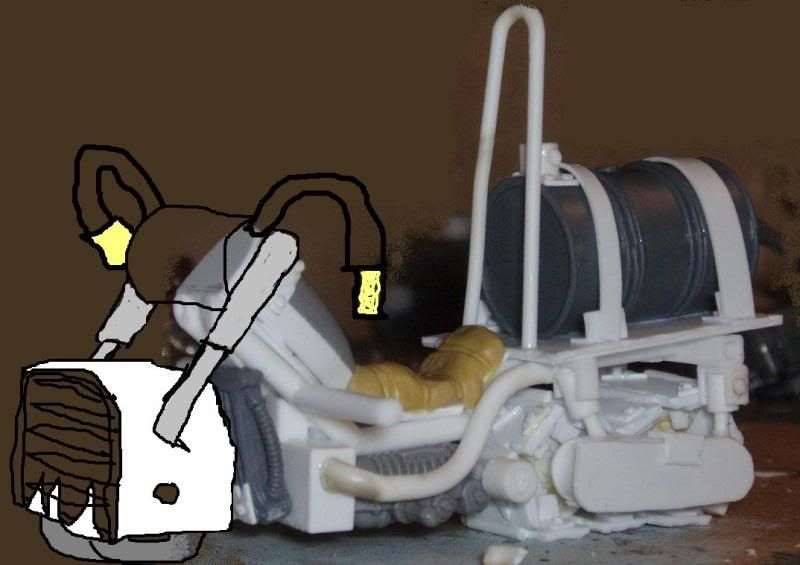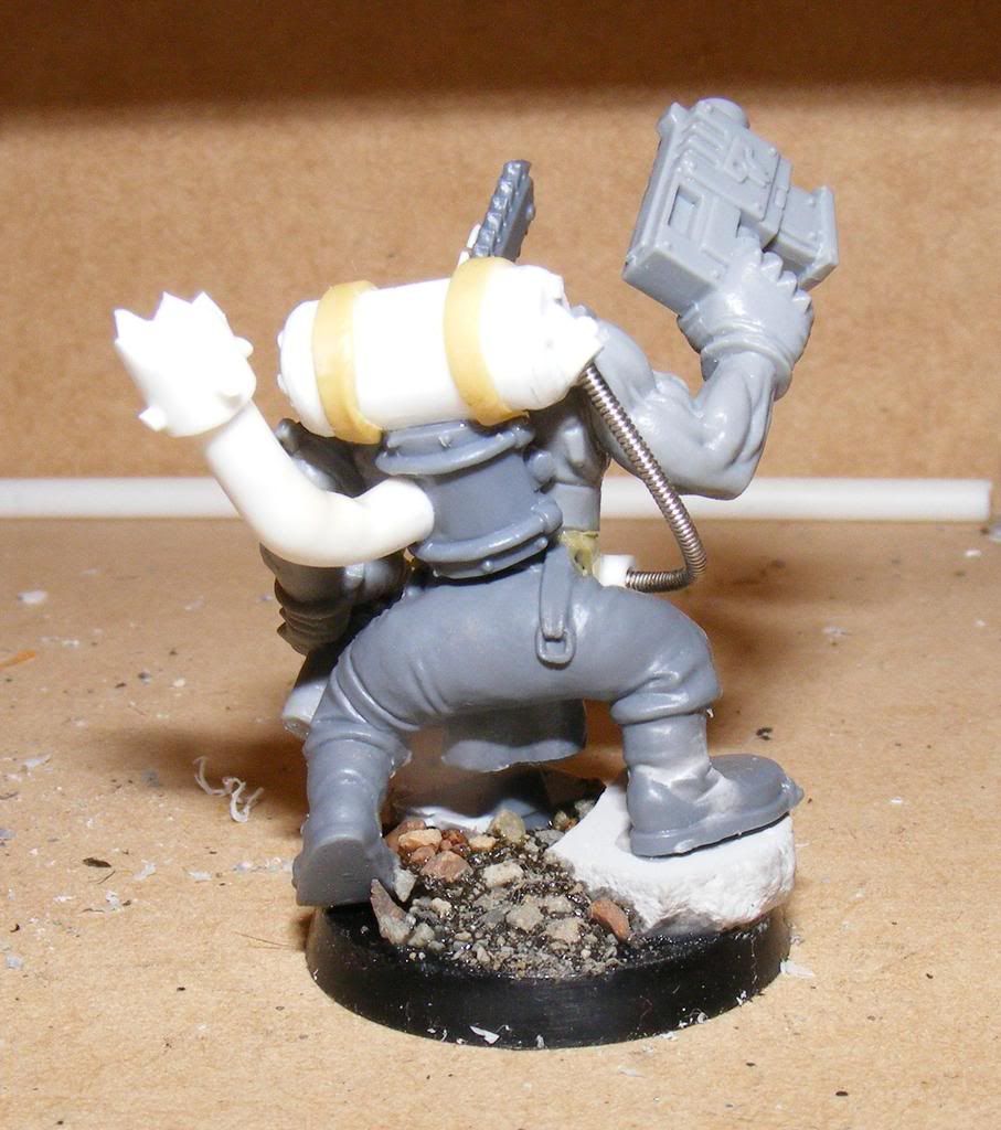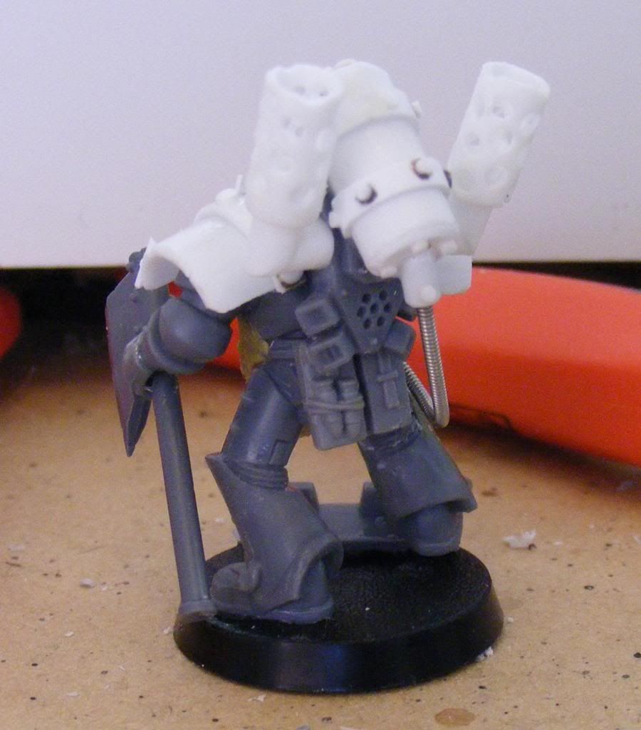 Thinking about the larger picture I wanted a hooded head and more canisters in his backpack than the other blokes. He'll have an axe and that Brand of Strongbad or what ever it is called, but how would you represent that? Some sort of chemical sprayer, but most of the chemical sprayers I am familiar with are kind of boring, just a pipe with a release lever where the hose meets the pipe. Any suggestions would be helpful!