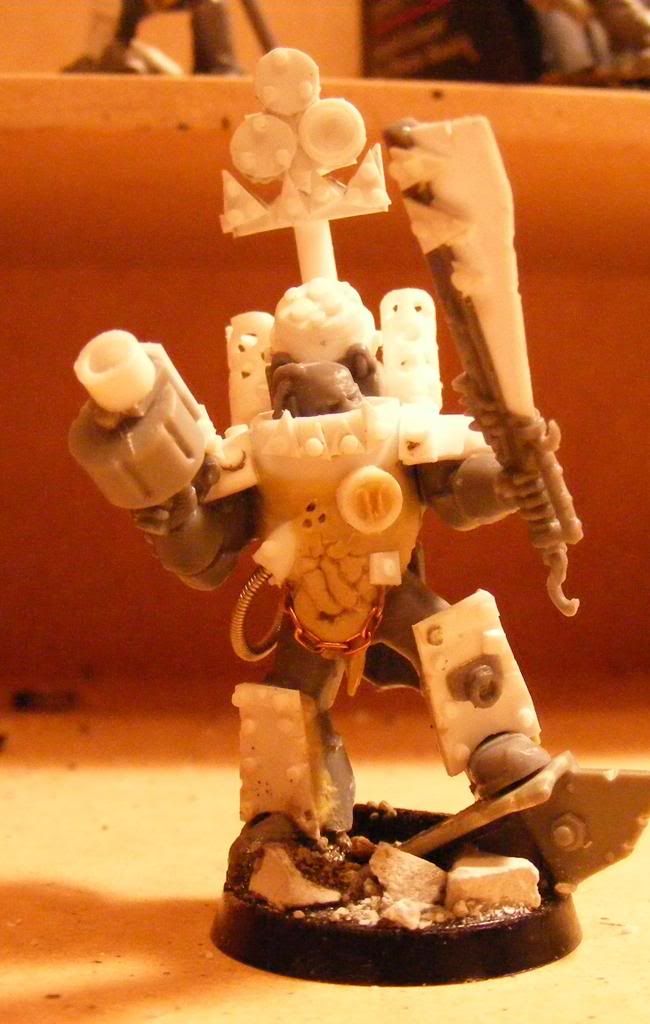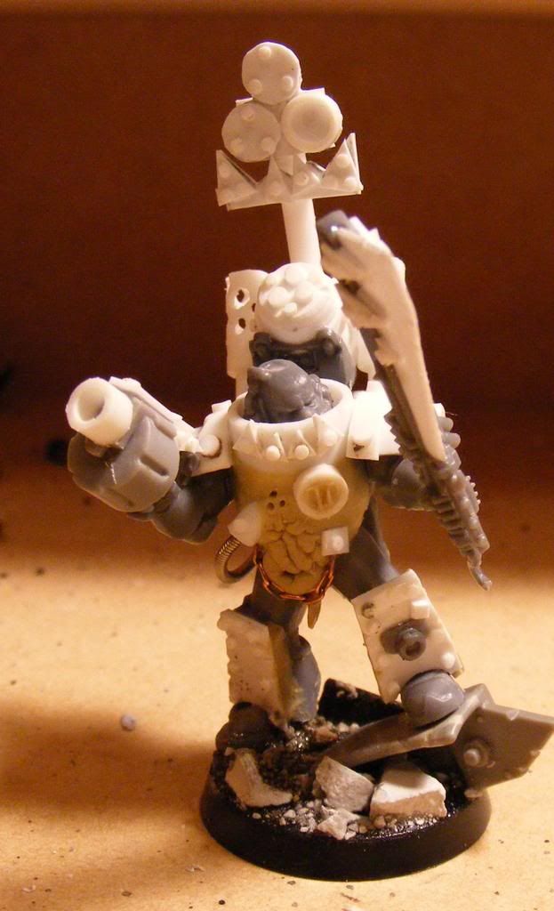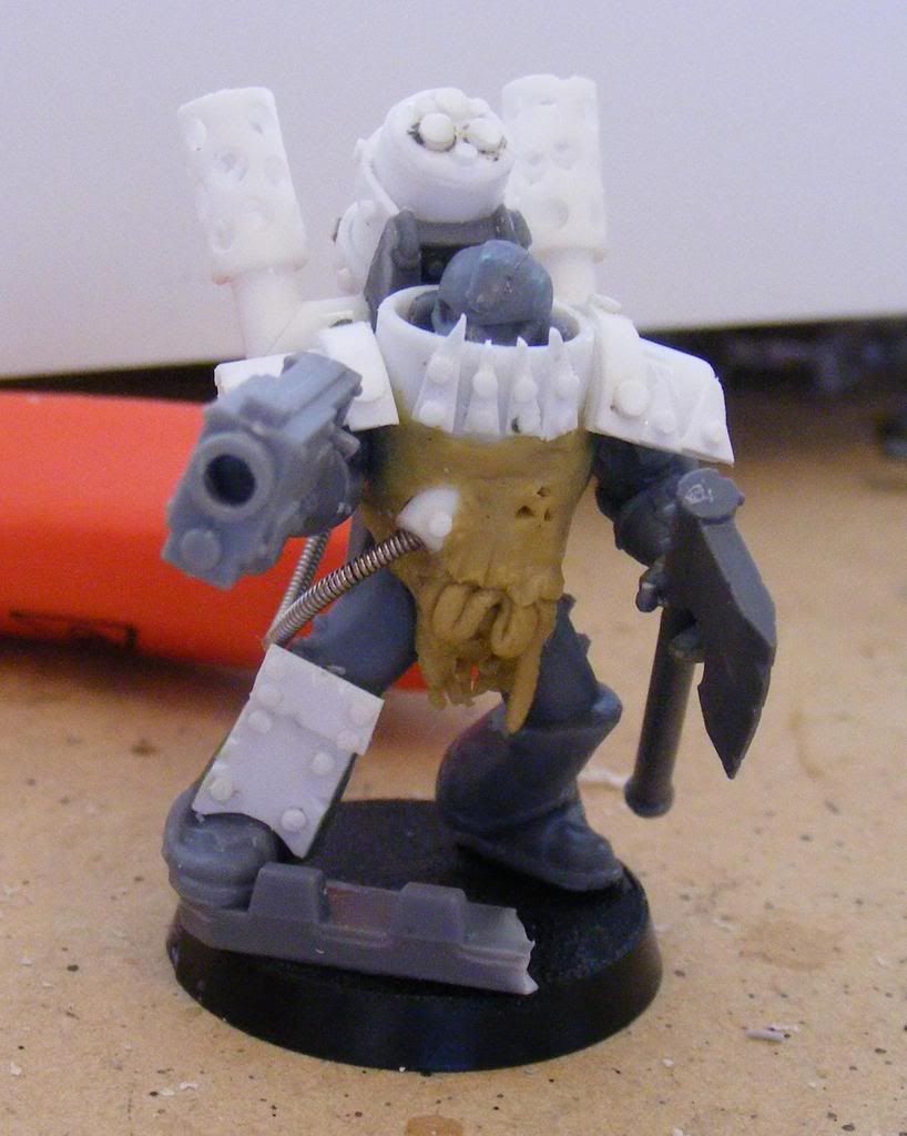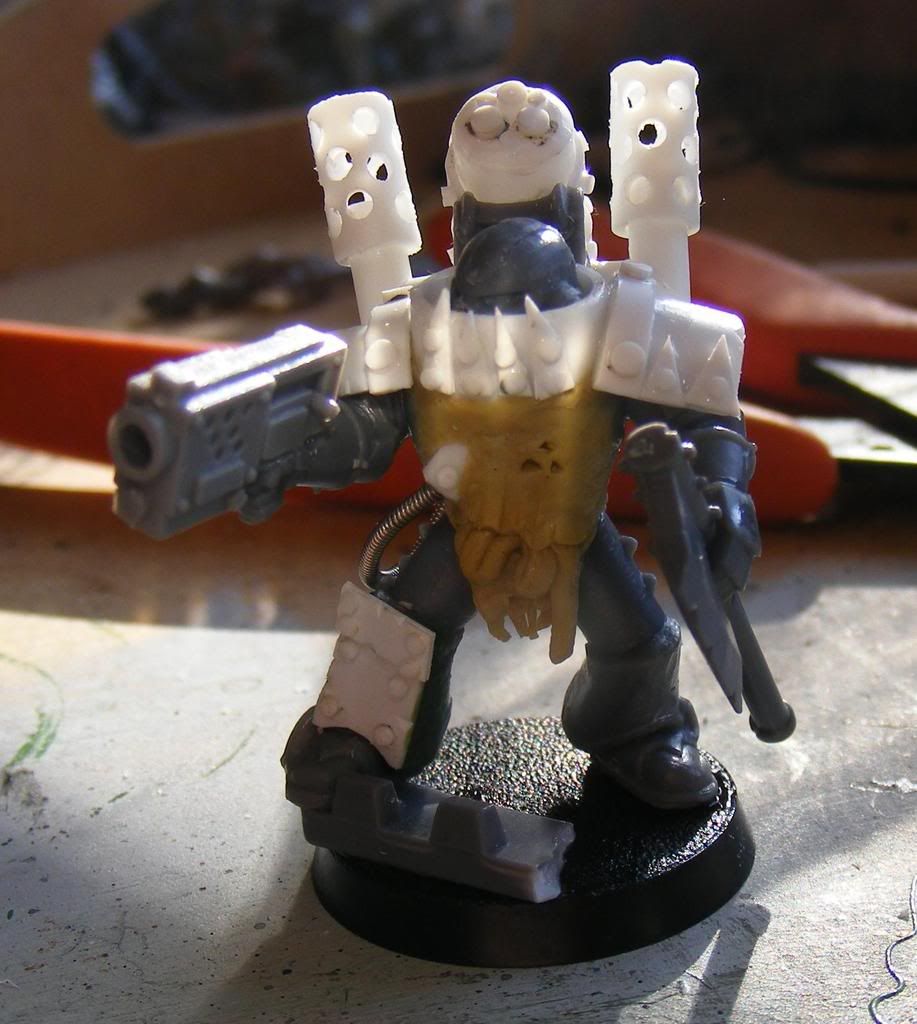 Here are some pics of the second Orky Death Guard guy. I twisted the canister around a bit (was that what you were envisioning, Ryan?), made the stacks more upright, made smaller rivets, and added more teethy bits.