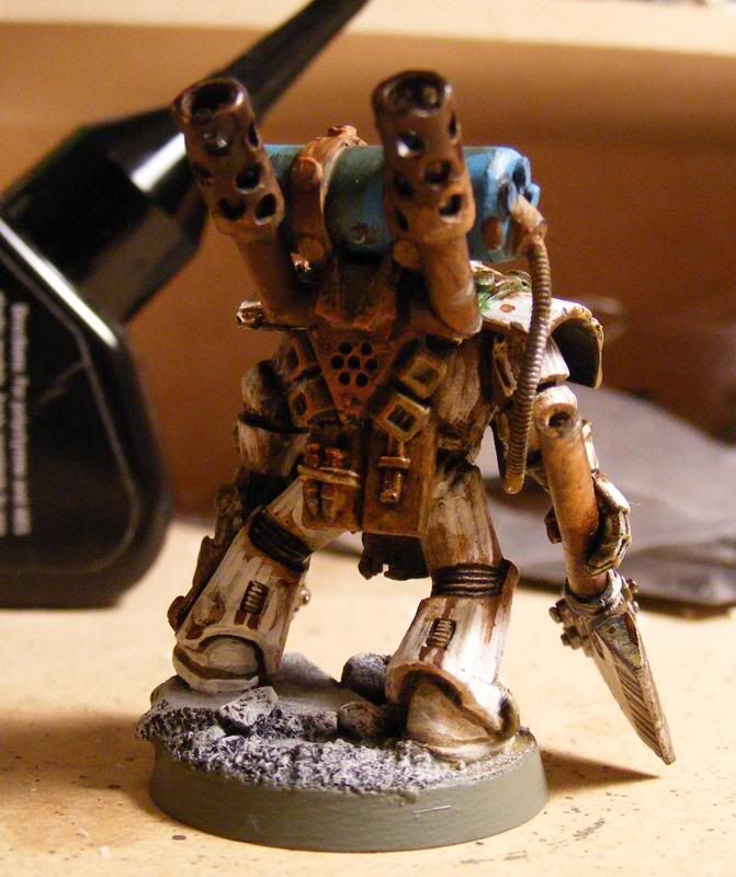 water down skull white and apply over the armour in thin, quick stripes, until you get a fair coverage. (this may mean going over some areas more than once but its dry as soon as it hits the model so it took no time.) once that was done i washed the armour again in brown, before going over it again with the watered down white.