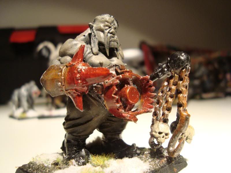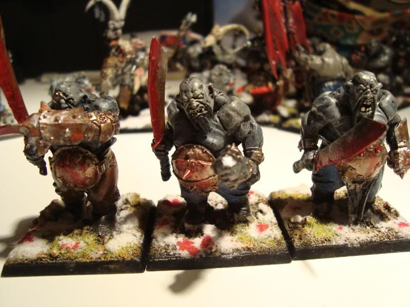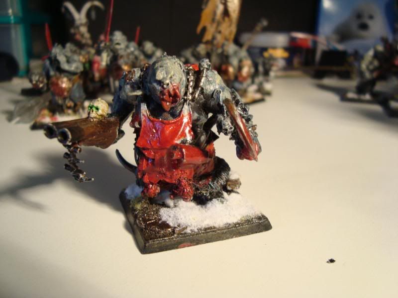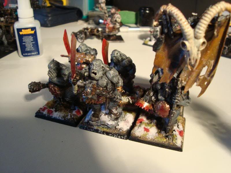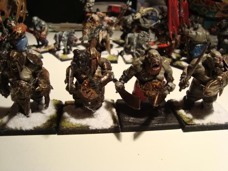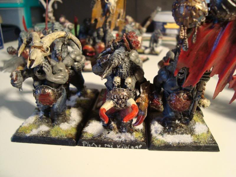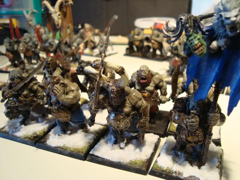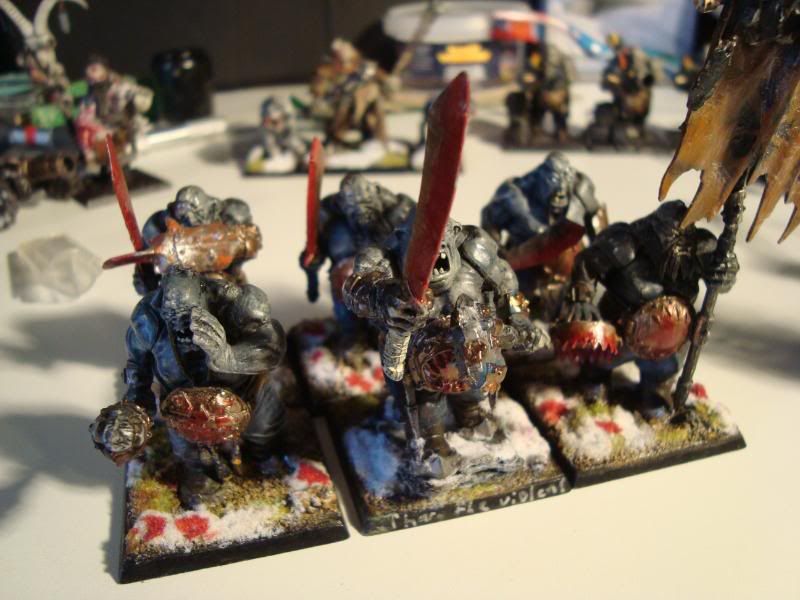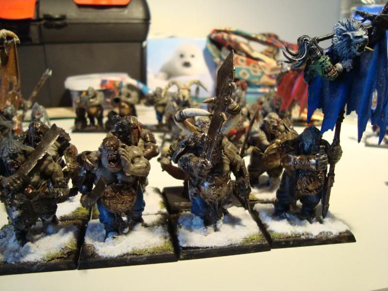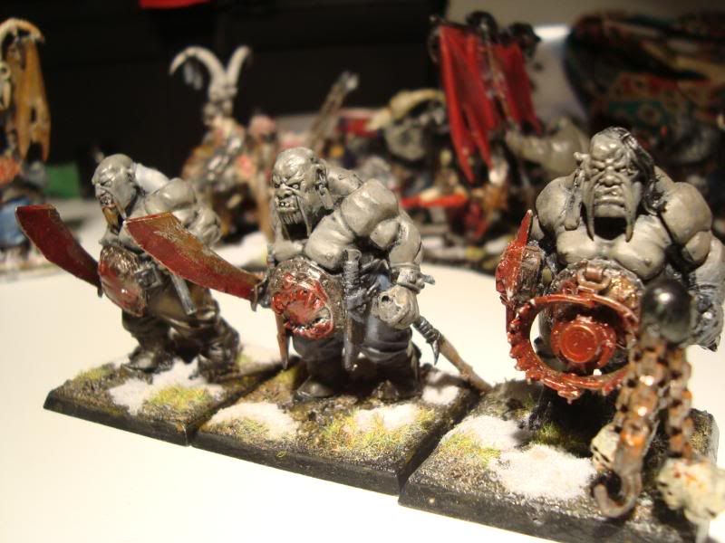 Here is one of the smaller bull units. It's the first proper unit that my army ever had. A few conversions, taking care not to make them look like they are supposed to on the box. Unfortunately, they are still blue, after I got the proportions of the ogre skin basecoat wrong. Still, they were better than my attempts at making the ironguts dark skinned.