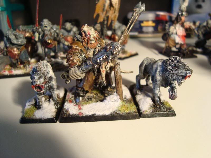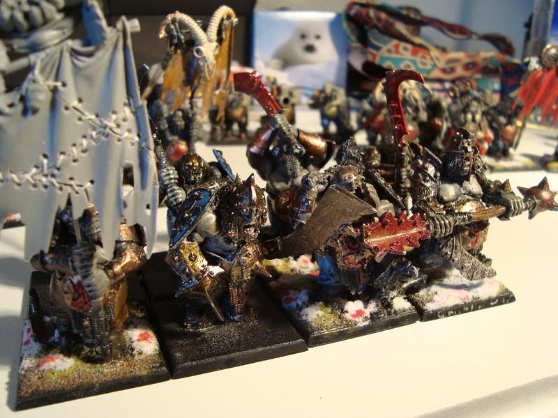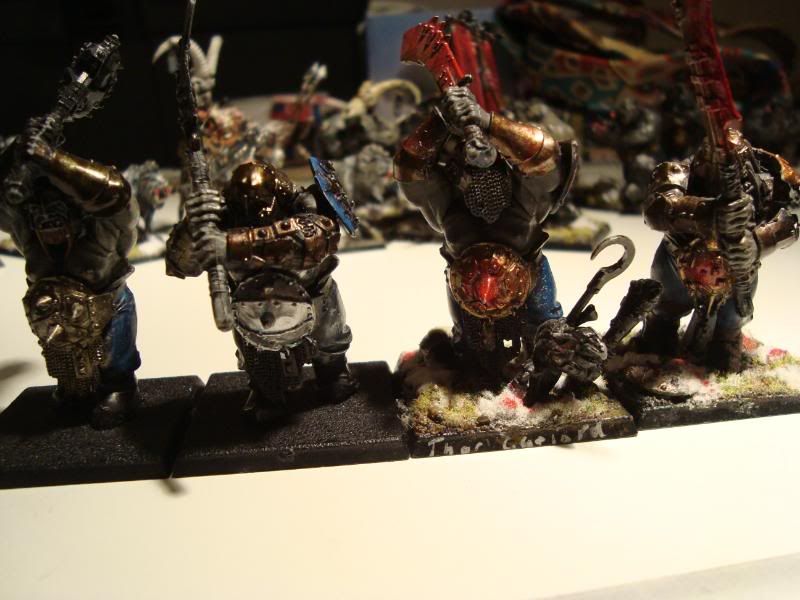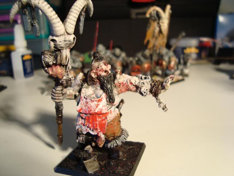 Second, the elite (1337) bull squad. It used to transport a butcher into combat, but then I decided that having the butcher in combat was not ideal, so I added another member. They are a mixture of ironguts, bull and leadbelcher bits. The reason that some of them have red lips is that I tried it on the one with the Great, Big, Bushy Beard! [/Hot Fuzz quote], and it looked pretty good. I didn't realise that it looked bad on the others until too late. Still, they are my favorite unit. I tried to make the banner look like it told the unit's history, but it didn't work that well. Still, nice to have trophies.