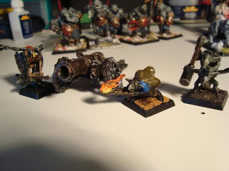 Finally, the gnoblars. There aren't any pictures of the units, as they are rather boring and unpainted, but here is one of my favorite units. I give you, the cannon. It counts as a dogs of war cannon, which makes the crewmen better fighters than the units of gnoblars. The conversions were fun to do, although I lost the one giving orders at a beachhouse and had to remake him. The others were also pretty fun. I probably should have gnoblified the cannon a bit more, but I like to think that they really take care of it and don't let any other gnoblars anywhere near it. It probably has the patronage of the tyrant. Sometimes I march it up with the ogres so I can grapeshot units as they try to get into combat with the ogres.