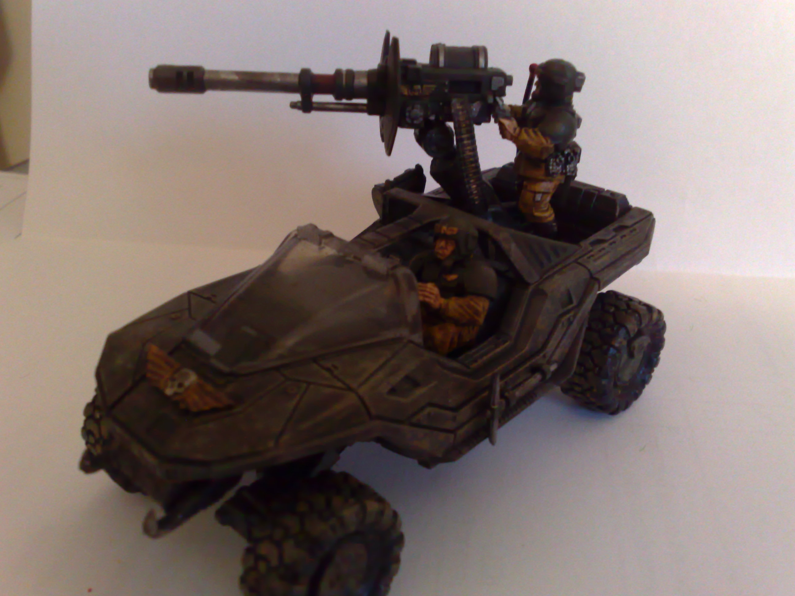 the buggy idea was stolen from warseers firebase, using heavy weapons teams autocannons and halo 3 warthog - if someone wants to make rules for them go ahead - i was thinking counts as sentinal, but moves like bike, can carry independent characters (points cost anyone).
