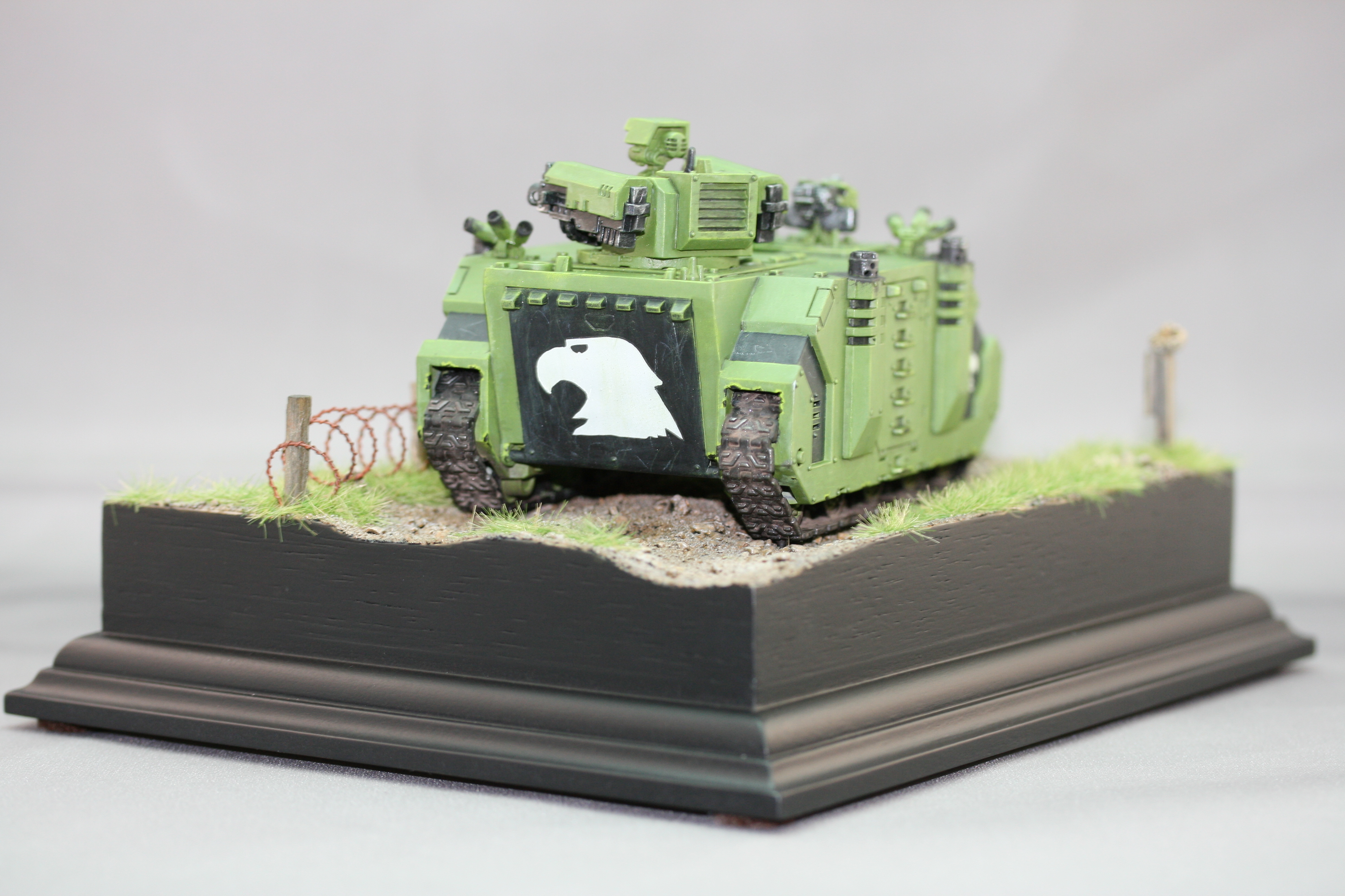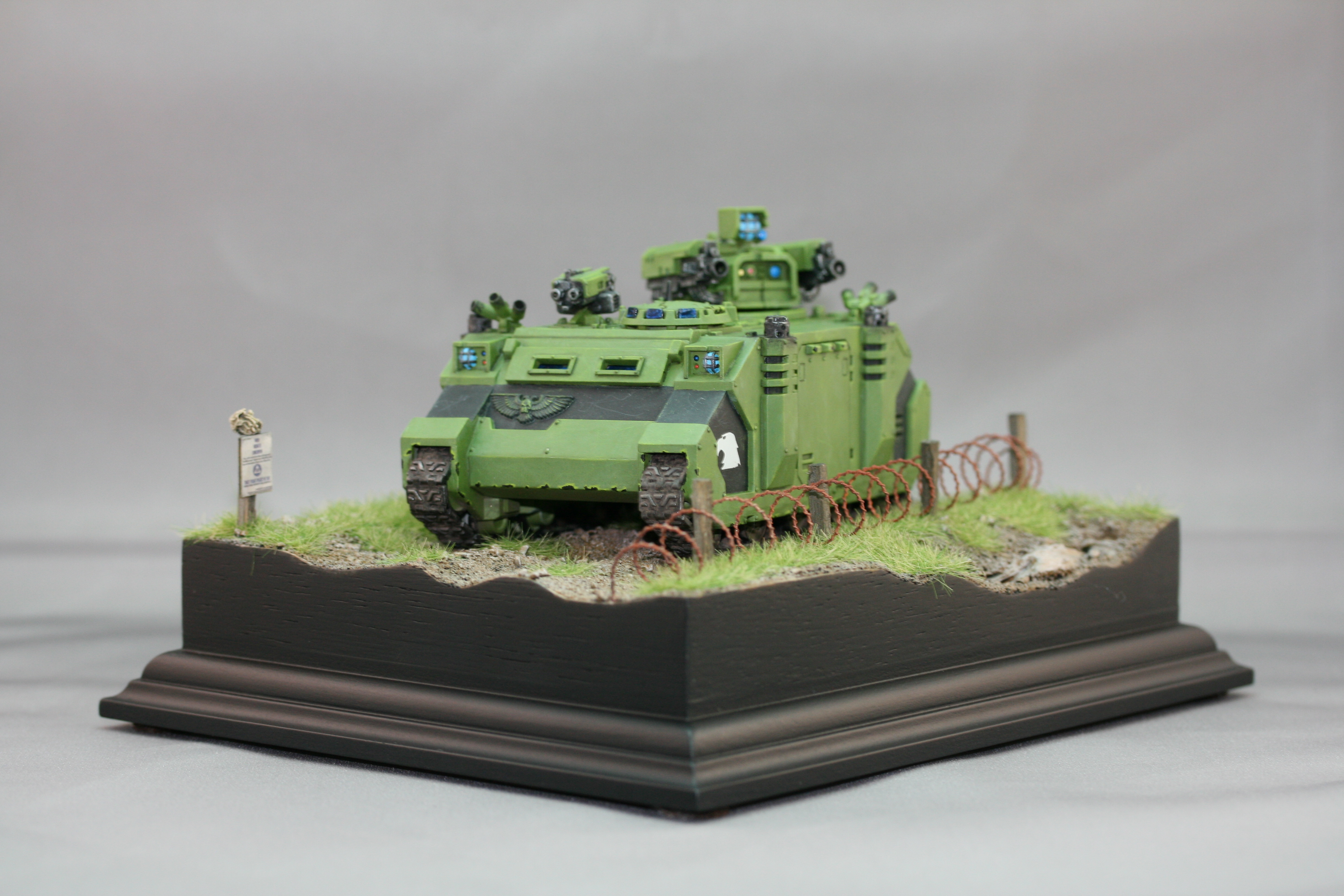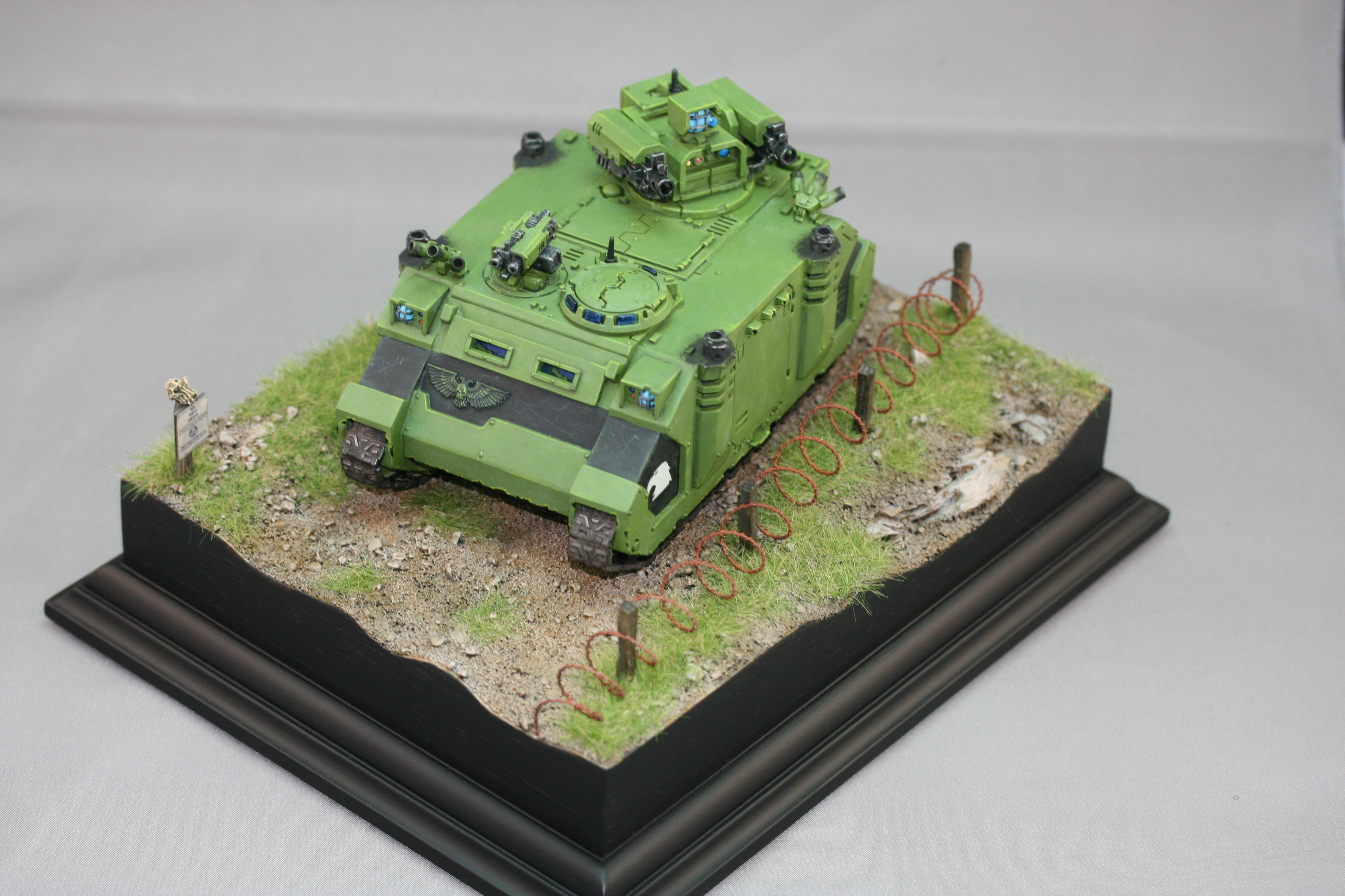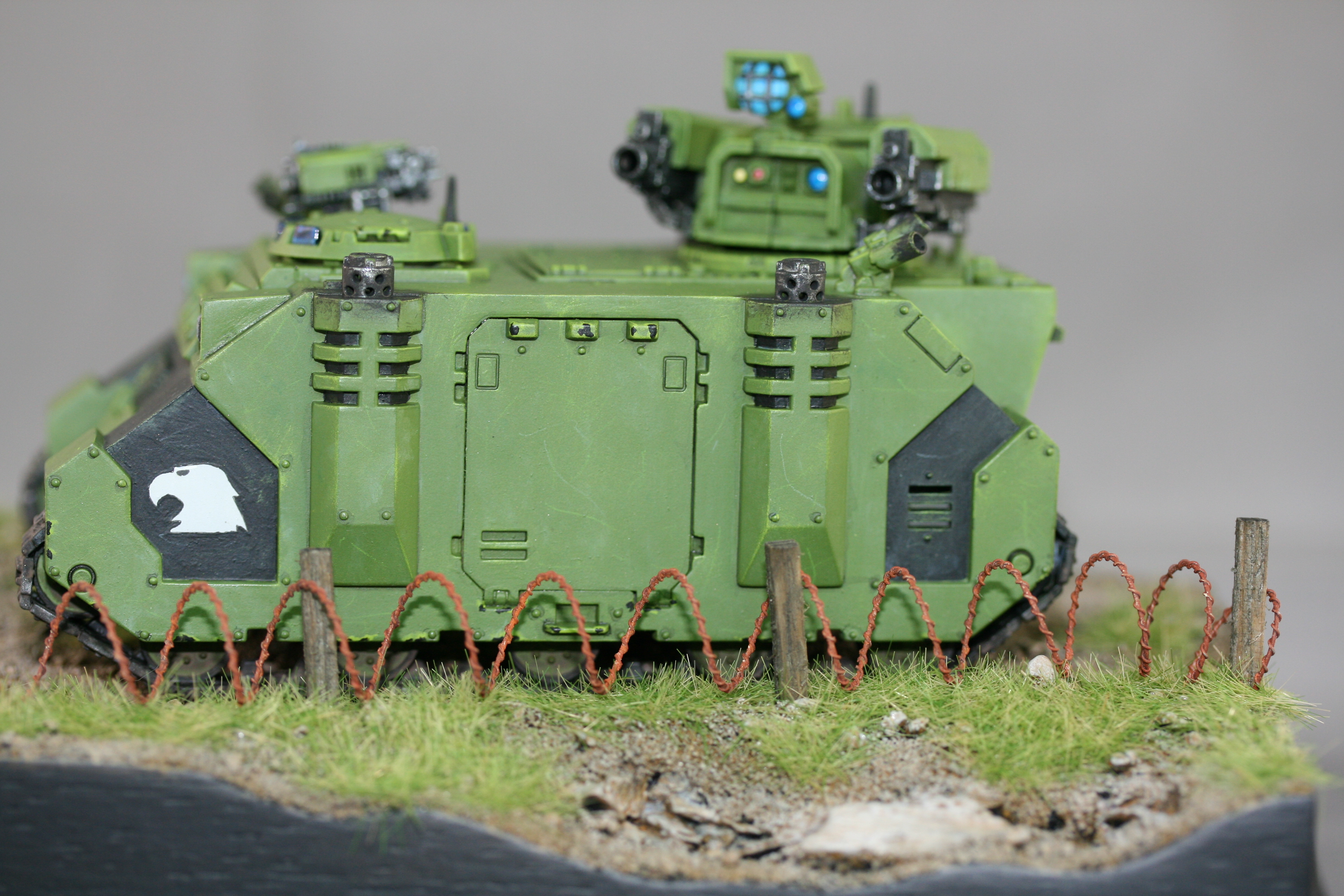 I like it, especially the barrels of the heavy bolters. It should have some unit markings like vehicle number, a name perhaps, some sort of devotional scripts/purity seals, cmapaigns it's taken part in etc. The ground looks good too though a tread pattern behind the tracks would look even better, at least have no stones sticking up where the rhino's been.