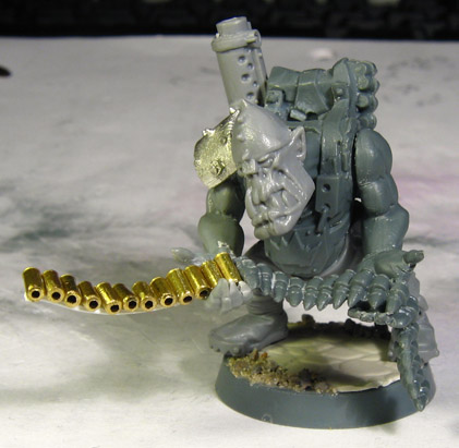 Not a huge update this time. I've been cleaning mold lines off of stuff, mostly. Also I'm waiting for the backpacks and kitbags that I ordered from scalehobbyist.com to arrive before I go crazy adding the details to the guys I've got so far. Also my friends have yet to provide me with my Black Reach orks. But here's a WIP of one of my Trencha' Boys. He's the heavy shoota boy for the mob, modeled to resemble the Trencher Chain-gun. He'll be getting a tripod for his gun to make him look a little more like it (the thing holding the gun up now is just a place holder). Also upcoming is the Trencha' feeding the bullets into the gun. Anyway, pics!