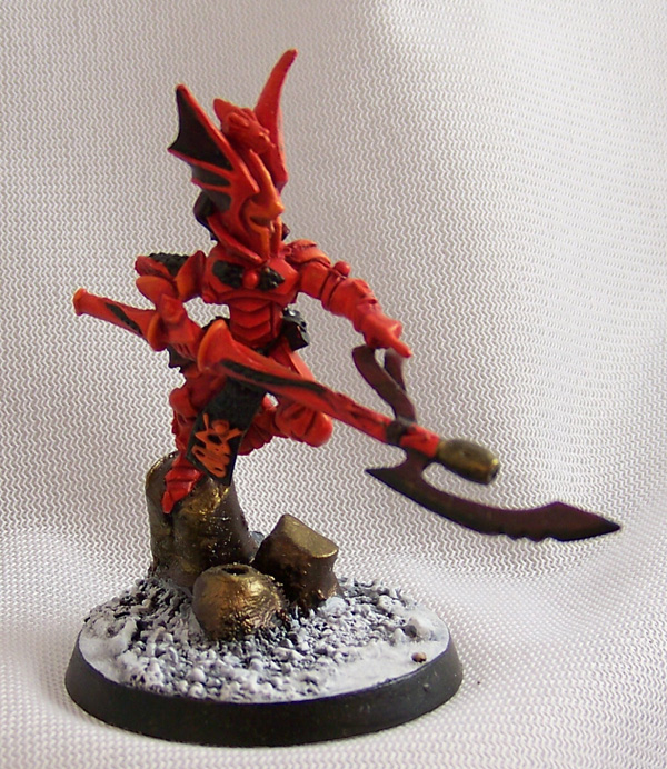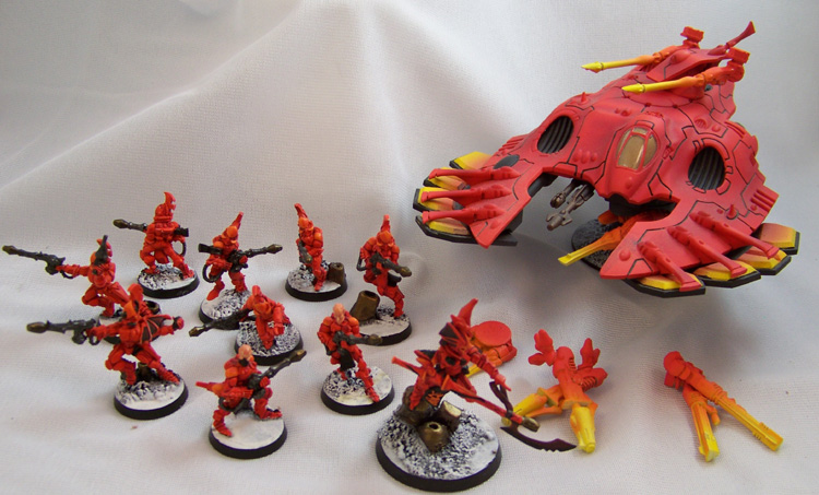I did some Fire dragon Aspect warriors a long time ago with conversions from other aspect warriors and an airbrushed magnetic tank for swapping weapons. The airbrush came out pretty well and the squad looks nie I think. I was particularly satisfied with the exarch conversion who actually used a lot of bits. being that the Eldar line is still mostly metal it has always been a challenege to convert aspect warriors to match the poseability in the other armies minis which are mostly platic. That said I really saw this squad as a success and they are almost entirely metal.
