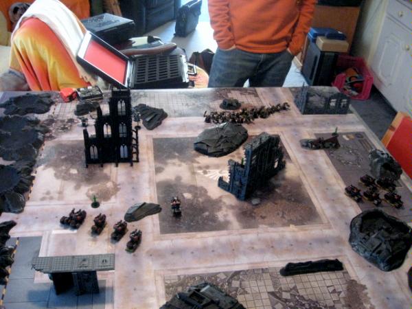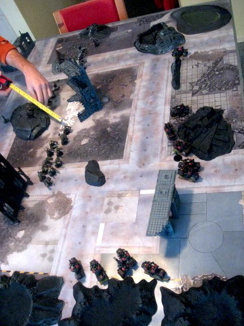 Obviously the same lists were used. We rolled up Capture and Control and each placed our objectives as shown. I decided to try something a bit different this time and broke the captain off for a cunnin' plan. I gave Gitsmack first turn and he advanced as shown.