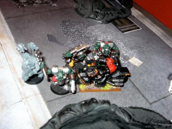 At this point the game had swung back and forth a couple of times. I thought I had it til his boss pole kept them in place, he thought he had me but the warboss got tangled in terrain. I knocked it down to 2 orks but the bosspole killed the last one and left the nob there and the boss got the charge in on my captain (which was it's own unit now as it hadn't been within 2" of the other squad during a movement phase and his own bikes were wiped out)!