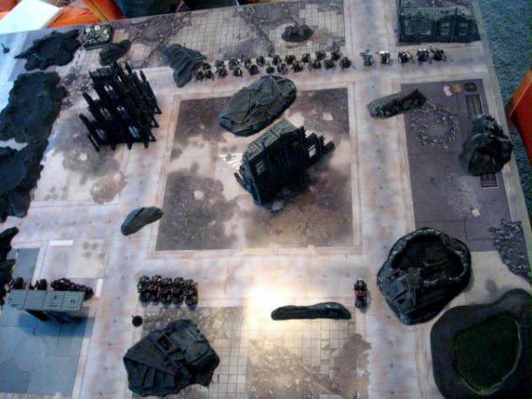 We rolled up a Seize Ground (4 objectives) and had to fudge placement just a little bit because we were just playing on a 4x4 table. Deployment looked like this