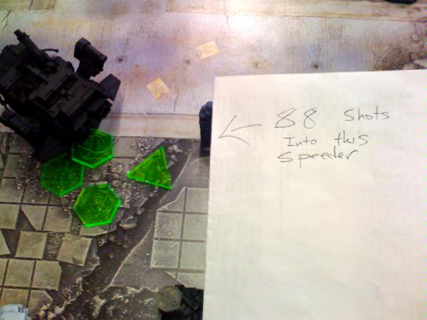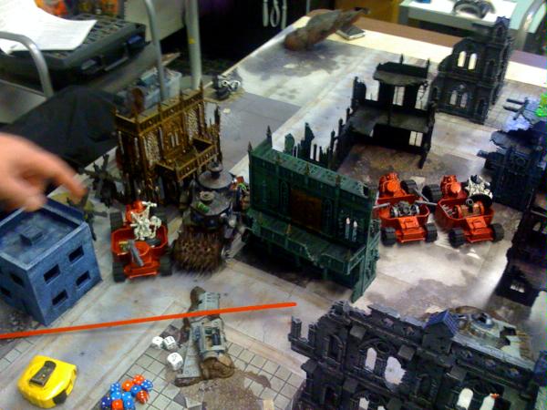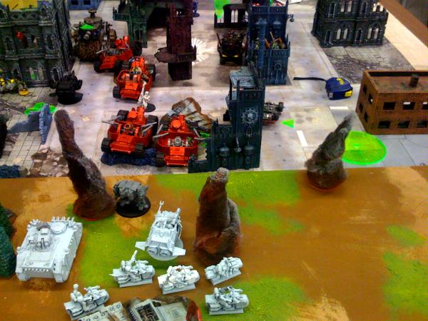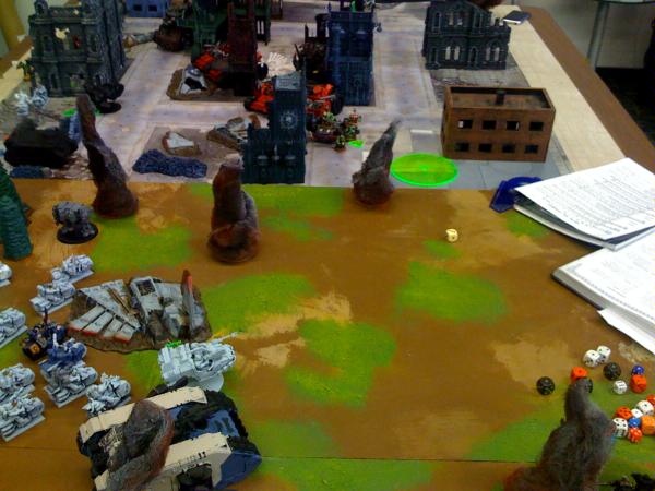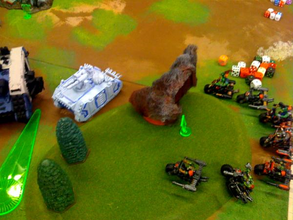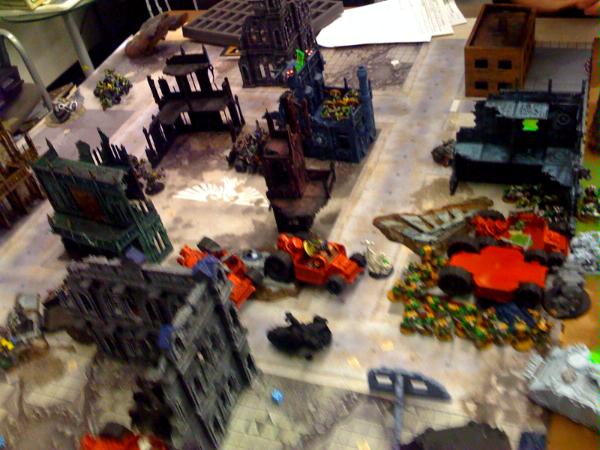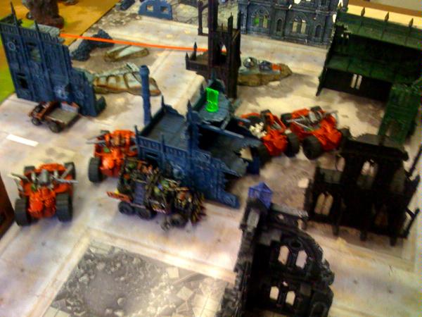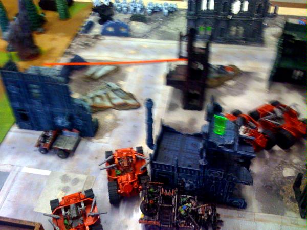 This is the set up phase. The Red range sticks are used to measure out the center of no mans land. Marines are played by Rich "Warborn" Romo, Mike "Derry" Derry is playing the Orks Orks picked Flank Attack while the Marines picked Legion Relic Orks Bid 10 minute set up while the Marines picked 15, meaning the Orks got first turn. Set Up: This was a Standard Apoc game, the first one I've played or Ref'ed (as I Ref'ed this game). 5th Ed makes holding those objectives tougher as only Troops count for scoring, but we also played that any unit counted for contesting an Objective. 1  Set Up: This was a Standard Apoc game, the first one I've played or Ref'ed (as I Ref'ed this game). 5th Ed makes holding those objectives tougher as only Troops count for scoring, but we also played that any unit counted for contesting an Objective. 2  Set Up: Sneaky Scout set up deep in enemy territory. 3  Set Up: Marines Rough Summery, Land Raider Redeemer, Suppression Force (2 Whirlwinds and a Land Speeder), 3 Tac Squads(10 Man Strong) with Rides (2 Razor backs, 1 Rhino), 1 Attack Bike Squadron, 2 Bike Squads, Bike Commander, Bike Command Squad, Venerable Dreadnought, 2 Scout squads, 1 Predator Destructor, Vulkan,and a few other characters. 4  Set Up: Rough Summery, Orks had a few trucks, Kopters, 3 Meks with Force Fields, 5 Battle Wagons, 3 with 20 shoota Boys and 2 with 10 Nobs all with Twin linked shootaz and Pain boyz. All Mobs had a Nob with Power Klaw. This was a compact and quick moving army. 5 6 7  The Game is underway 8 9 10 11 12 13  Mike's "Wall o Battle Wagon" roll into position to rain lead on the Marines. 14 15 16  Wagons move to support the Nobs in the Chapel. 17  The Battle of the ruined Chapel begins! It will rage all battle and help decide the overall victory. 18  This Land Speeder Soaked incredible amounts of Fire power. After 88 shots the Skimmer had been Shaken, stun, Immobilized and had it's Missile Launchers destroyed. It's resilience proved the first of many game turning events in favor of the Marines. 19  Shaken, Stunned, Immobilized and Weapon Destroyed, but still alive and in the way. 20 21  The First Ork Casulities a Trukk squad get's Pummeled by Marine Heavy Weapons fire. 22 23  The "Frost Wing" Bikers of the Storm Dragons race to meet the Orks in close quarter combat. 24 25 26  War bikes from reserves roll in and Dakkate the Scout squad that was holding the enemy objective. 27 28 29  Terminators teleport behind Enemy lines, and while they died the the man in the next Ork turn, they pull the Mega Armored Orks away from the front lines. 30