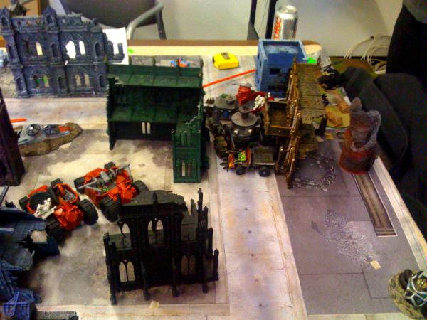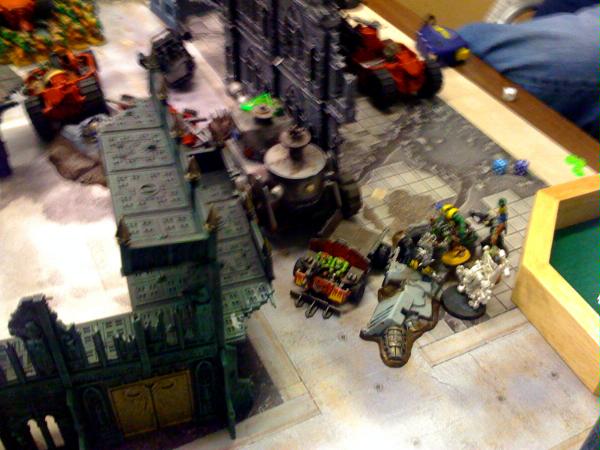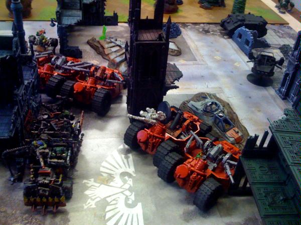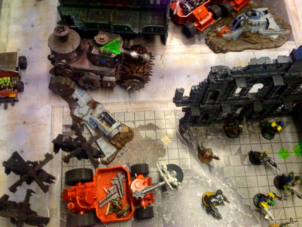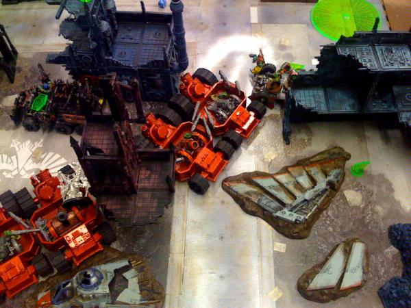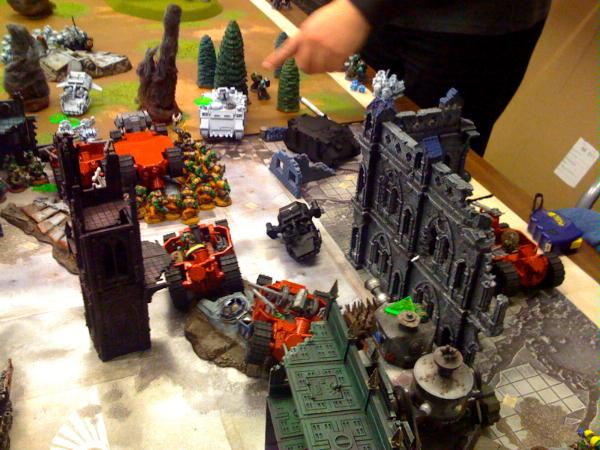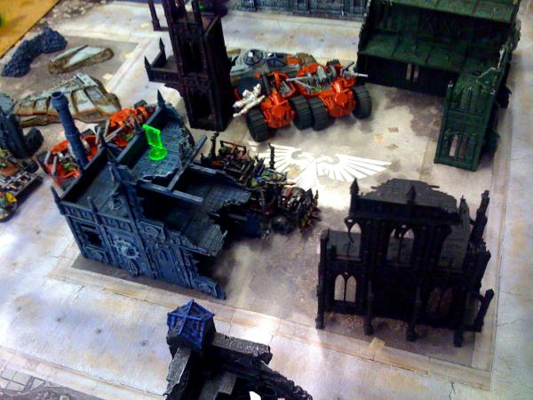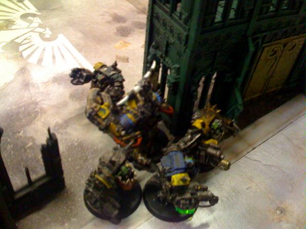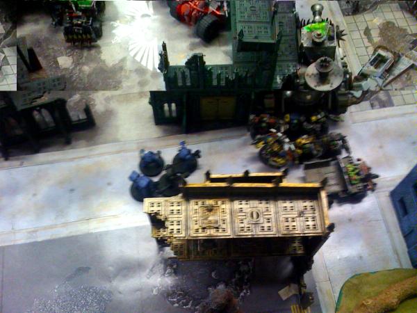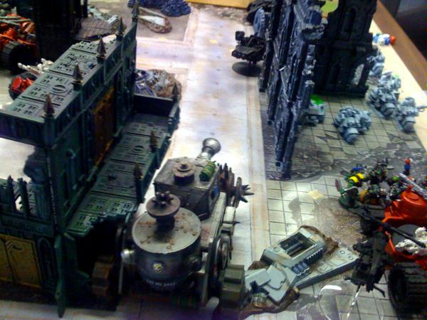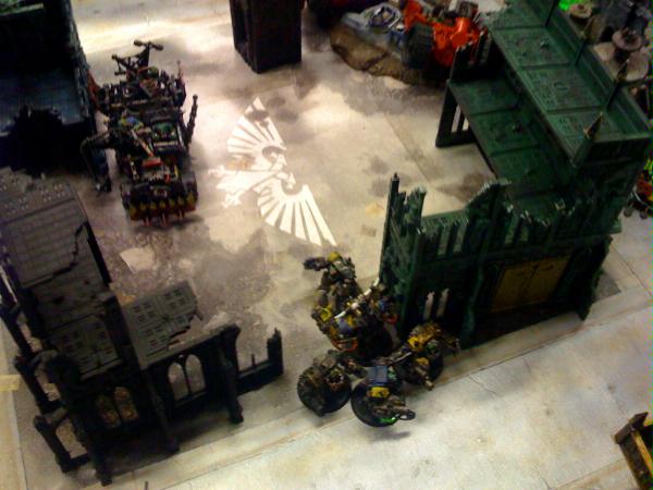 Top of turn three 31 32 33  Mega Armor Rush, well Stumble at High Speeds into the Deep struck Terminators and Roast 3 With Scorchas, before Charging in to finish the squad off. 34 35 36 37  Mega Nobs rush back to the front, but won't play much part in the remaining battle. 38 39  The Dreadnought wrecks a Battle Wagon! Orks charge forward ready to engulf the Venerable dread. 40 41  The Boyz dismount, ready to kick ass. 42 43  Second squadron of War bikers Destroy the Scout squad in a Hail of Fire. 44 45  A squad of Nobs with Twin linked shooters can throw out potent firepower. This Squad held the Chapel for several Rounds. 46 47  The Shooting Begins, dropping the 20 orks to 15. At the time a great debate opened up about if shooting was a good idea, as Mike could pull causality to denie the marines the needed charge into close combat. However those extra 5 dead orks turned out to be very important, as the Shoota boyz ended the combat at 7 orks, meaning it was no longer fearless and would break when if morale tested with a -7 penalty. 48 49 50  Command Squad on bikes escorting Commander Bikesalot armed with Legion Relic. 51 52  The Biker Command Squad Charges in causing 8 wounds to 1, allowing they to overrun the orks, killing them all. This denied the Orks the Objective in the dark blue Mechanicius building 53 The Game Ended with the Marines controlling 2 Objectives to the Orks 1 (They Won the Ork Chapel, but didn't have the Troops close enough to hold it). The Game lasted almost 6 hours and 4 complete turns where played.