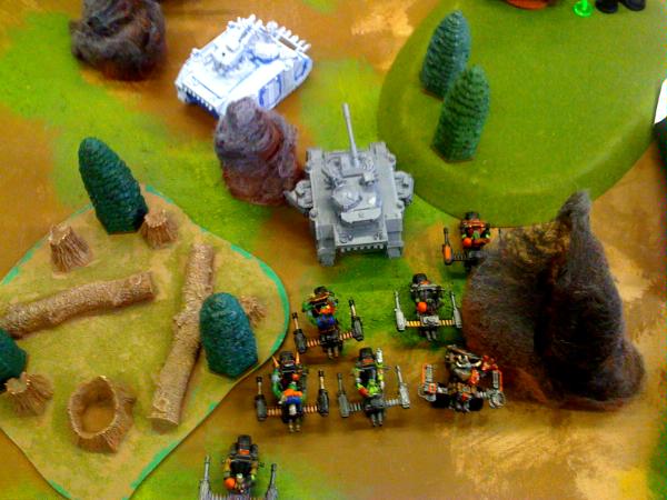 The Redeemer got pulled away from the front to take care of flank Matching Ork Warbikers. I was kinda an Eye opener about how hard it was to get the Redeemer's flamers into play, I think one fired once, the rest of the time the Redeemer was moving and firing the Assault cannon and Multi Melta (go Machine spirit).