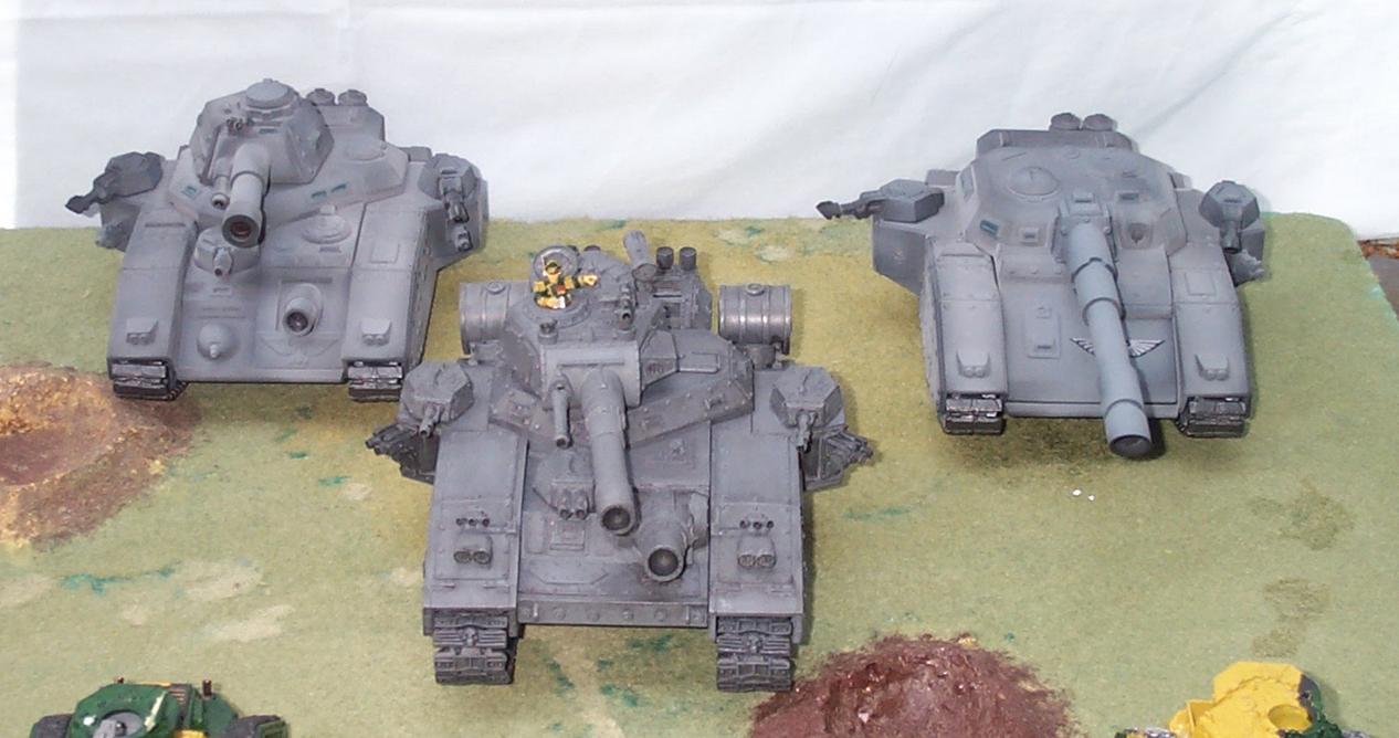 The Lucius Pattern Baneblade in the forground is my favorite tank. I picked it up on EBay for next to nothing and it was a pityful wreck with the treads glued on backwards and globs of glue and paint all over it. After I lovingly scrapped all the paint and glue off I pried apart all the pieces with surprisingly little breakage and reassembled. That project will be documented in another thread.