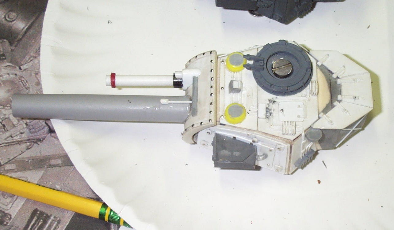 I had purchased a bag of mixed brass tubing scraps years ago at a hobby fair and with a razor saw and jewellers files a managed to cobble together a fair looking set of lascannons. The lascannon base was a piece of thin printer case material and the electrical cable the very thinnest styrene rod superglued together and inserted into a very thin brass collar. The cannon barrel and details were all superglued together (no soldering required) drilling an appropriate sized hole into the turret and supergluing the cannon assembly into the turret brought me to the stage pictured below.