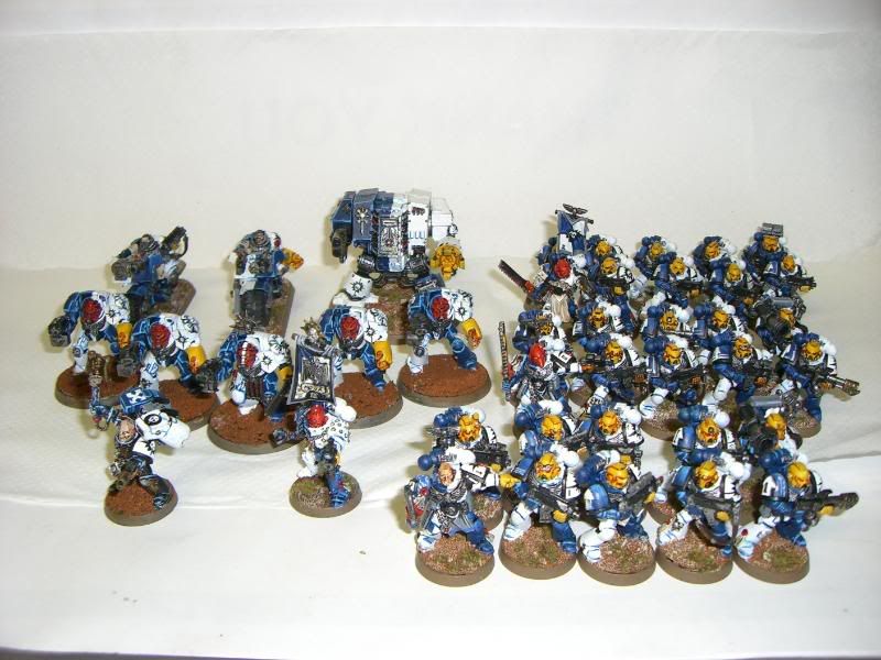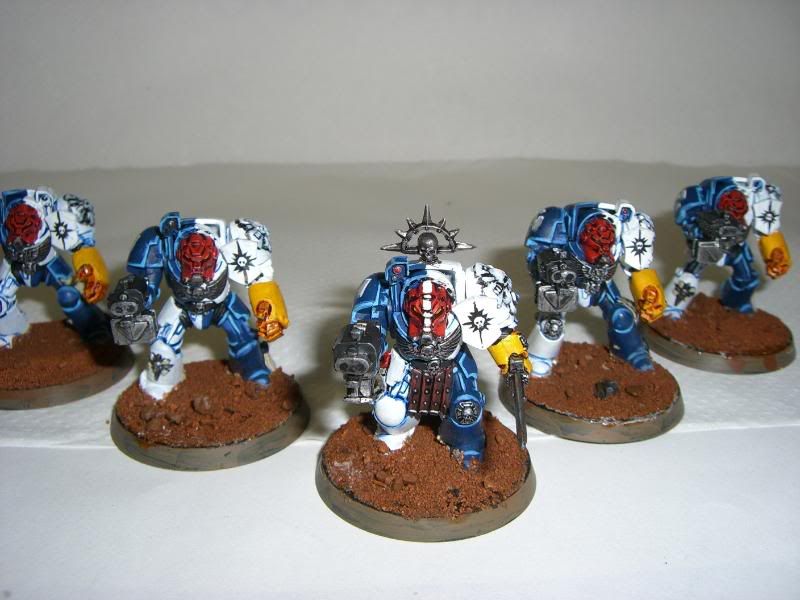 reasons for this question is that i started out wanting to paint Nova marines with is mainly bleach bone/regal blue torso and arms and a regal blue /bleach bone legs along with a complex chapter symbol...well complex if I'm trying to pain the damn thing on... for reasons of my own insanity i really didn't like the bleach bone and switched it with skull white, and it looks fragging nice...the other problem is...well some how i ended up flipping the damn colors completely..mainly to get a white left should to paint on the more easier to paint chapter symbol...so they are regal blue/skull white over skull white/regal blue, all regular troops get yellow helmets, elite...Sgt's, termies, Hq's get red helmets....